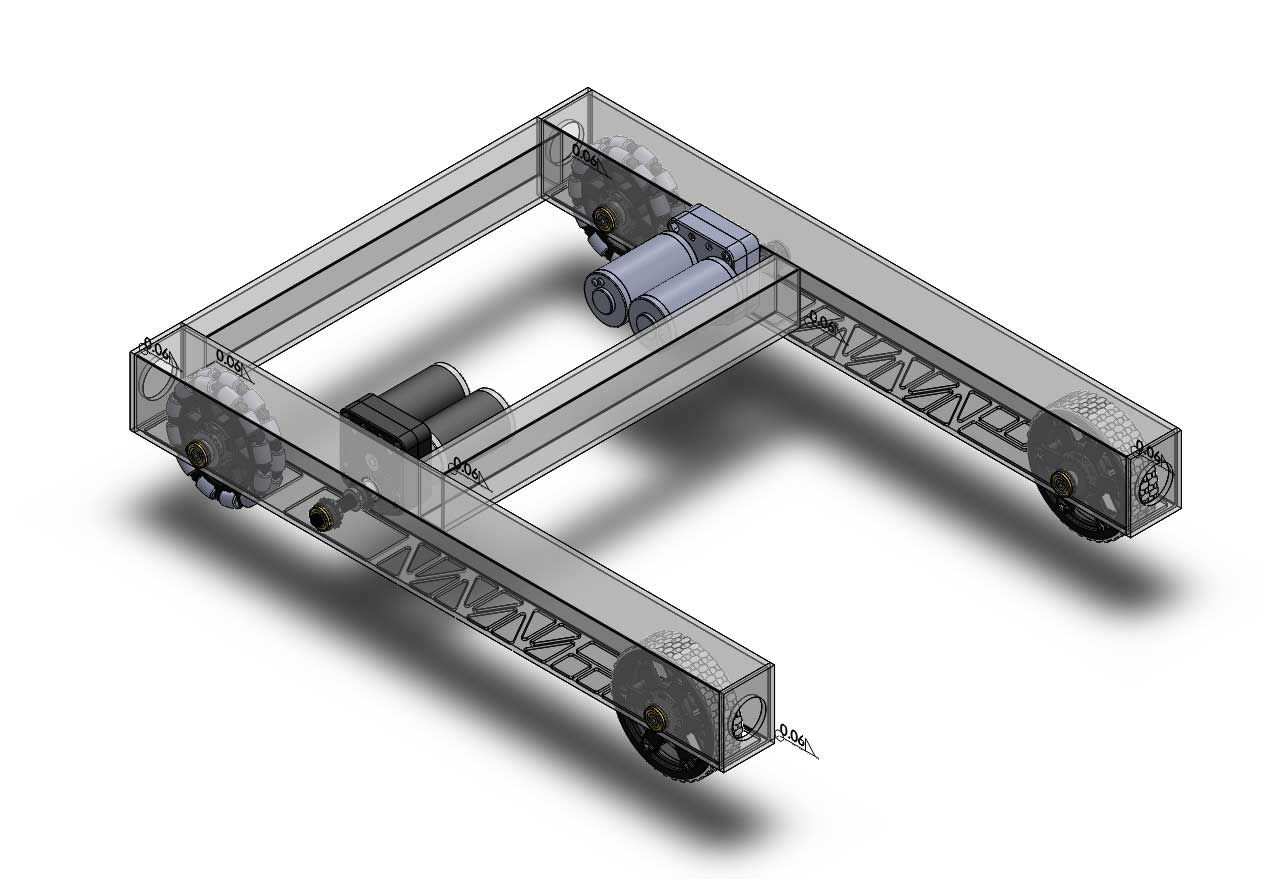 With the frame of the sample and custom robot completed, the drive system can now be added. This process may involve making some more model parts and/or downloading and importing pre-made components, to start to build your drive system virtually in SolidWorks.