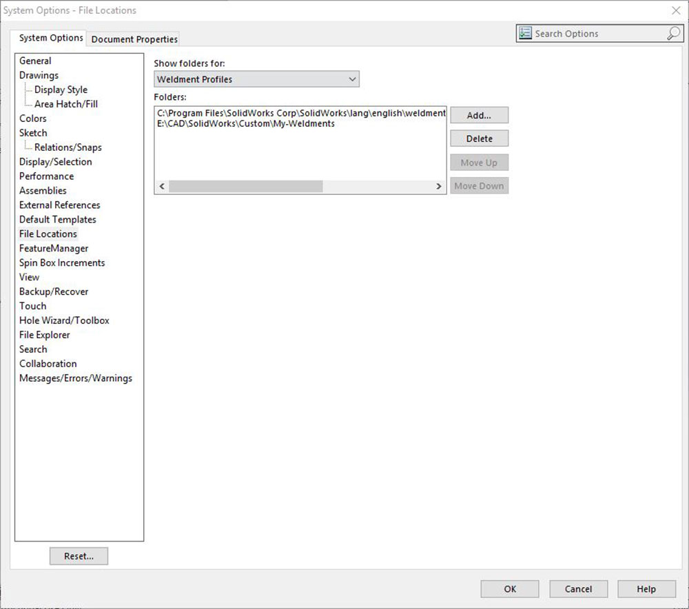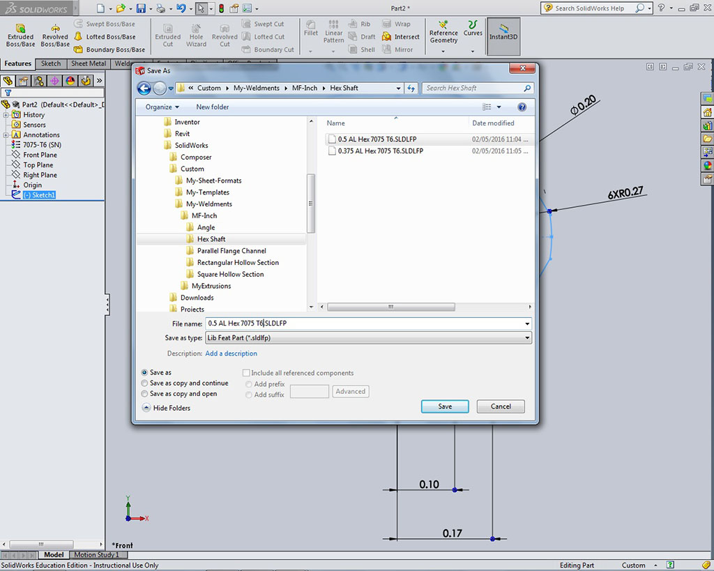 23. Save with appropriate file naming conventions with Library File Part selected as file type and locate your custom weldments folder and create a Hex folder for your new 2D weldment folder