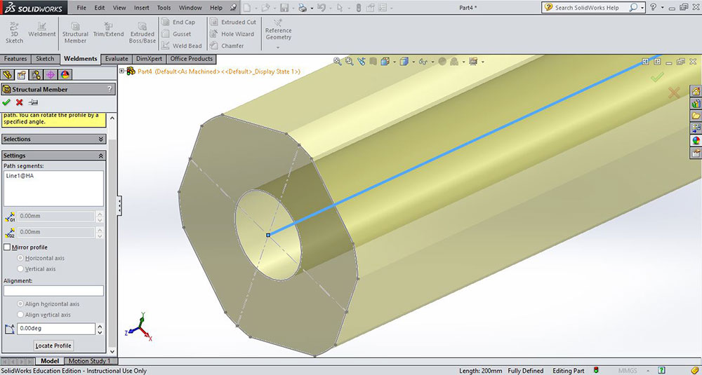 1. Create a angle weldment profile: 2.0x1.0x0.125-AL-Au-6061T6.SLDLFP