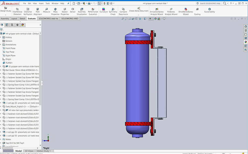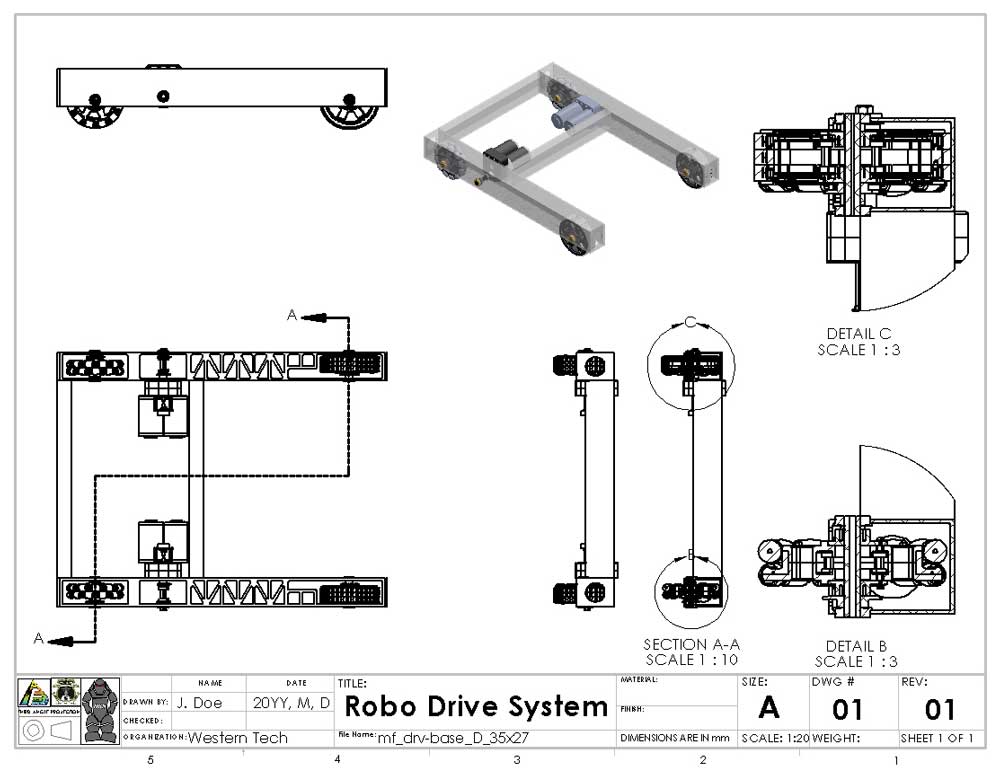 Create or download components needed for sample robot drive system, then create an assembly with the frame and drive system model components (sub-assemblies and parts). Using pre-made components, import them recognized or not into usable components in SolidWorks. Using the mating process, align and lock components to their correct locations to build your sample robot drive system. Folder organization for imported assemblies to be used for each wheel assembly, and sub-assemblies to be used for each front and rear drive systems. The main components you will be using can be found in your PMT pkg under the Material Cost Breakdown tab, an example table of what engineers use to keep track of detailed information on each of the components such as product name, descriptions, suppliers, part numbers,weight, web link, costs, etc. to later also include in drawings. Some of this list of components includes: