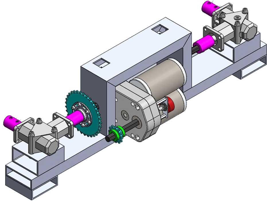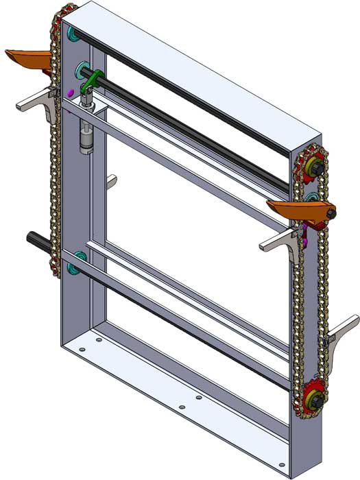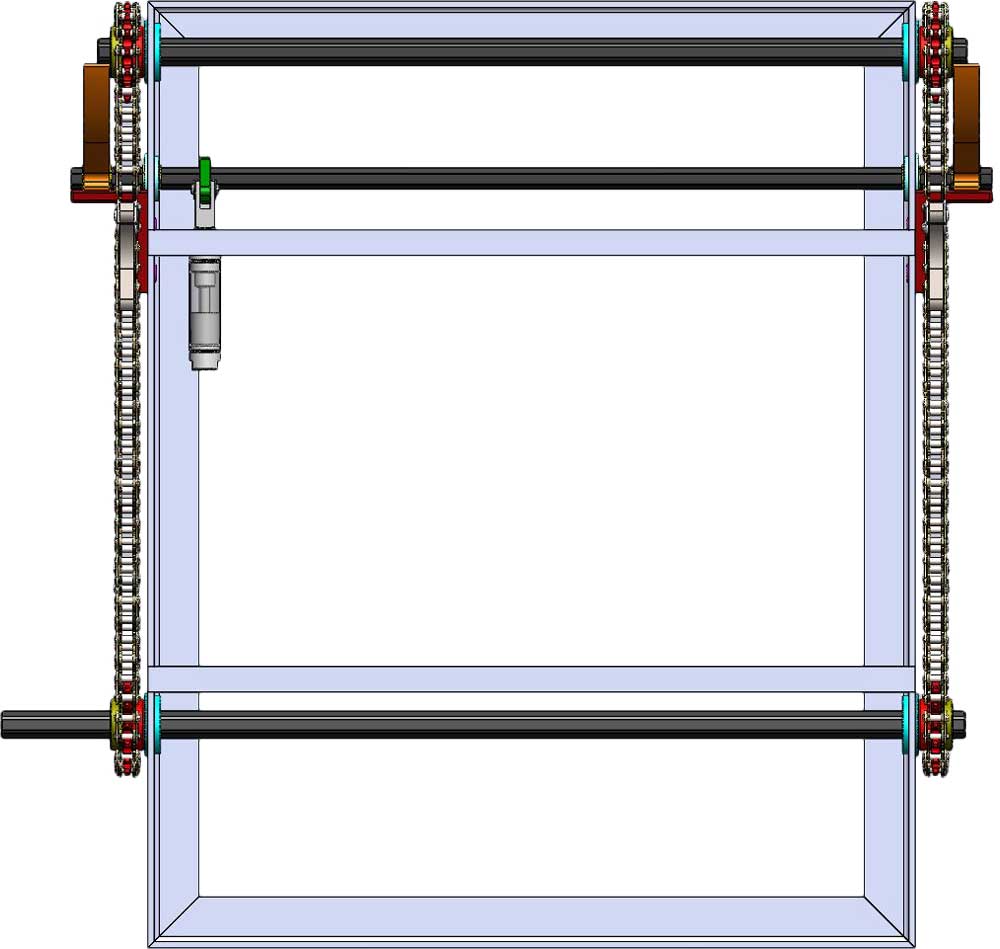 This elevator mid frame and drive system is what will run the two side tote elevator tote lifts. The rotation drive was placed horizontal to frame, connecting from a smaller sprocket off of drive gear box to larger sprocket to increase torque and reduce speed rotation. Rotation direction was changed using ninety degree gear boxes on both ends, thereby driving sprockets and chains on both side tote elevator lifts.