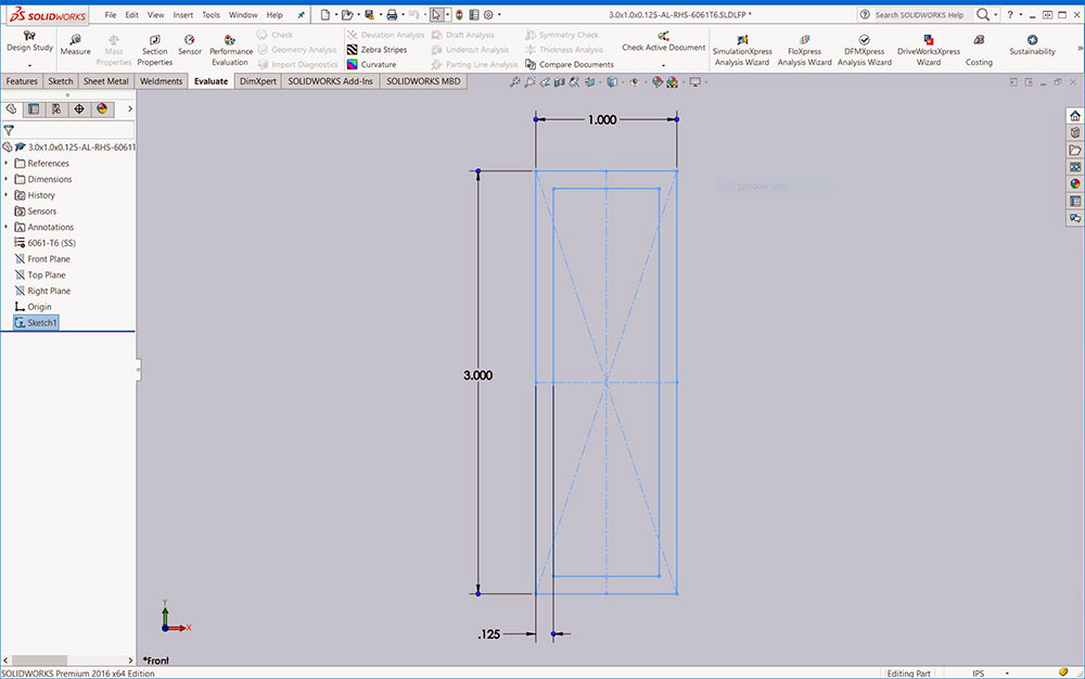 1. First step is to create a rectangular hollow section (RHS) weldment profile: 3.0x1.0x0.125-AL-RHS-6061T6.SLDLFP