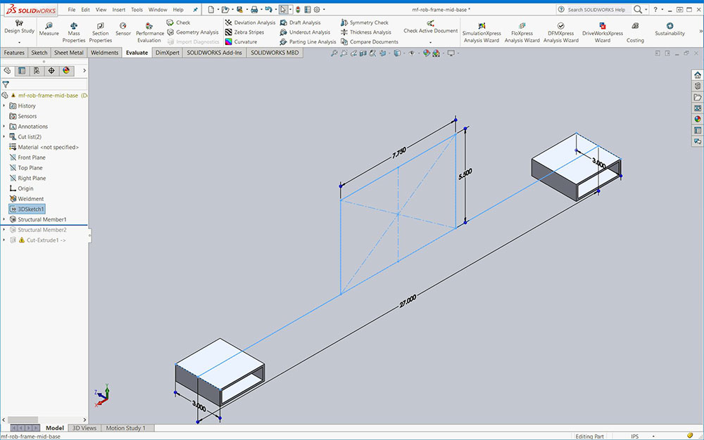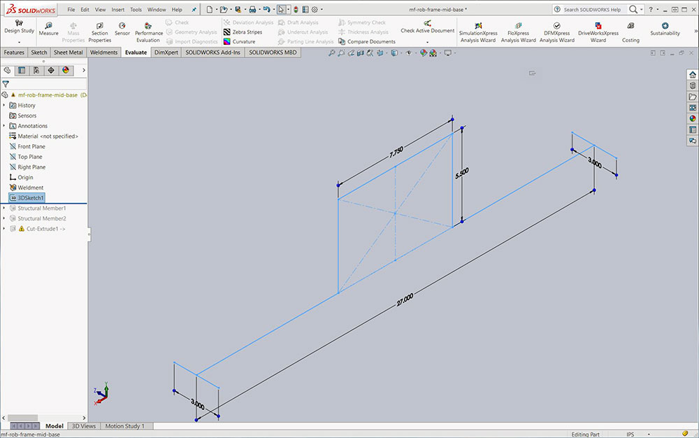 As you have already sketched using the 2D sketch tool to create several weldments. For basic shapes that the sketch only needs to be on one plane, 2D is fine, but once selected/started drawing in 2D you can't switch to 3D, so you need to select before hand to get the three point sketch feature. Note it is possible to add additional planes manually to your 2D sketch then continue the sketch on another plane, but is far easier to just use the 3D sketch tool. With a lot of custom frame components that look the same from a mid point, design the one half in 3D, then once finished adding your features to you 3D sketch, you can mirror making both sides symmetrical with half the work.