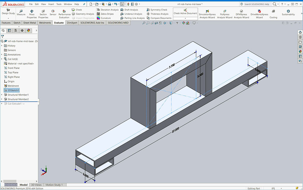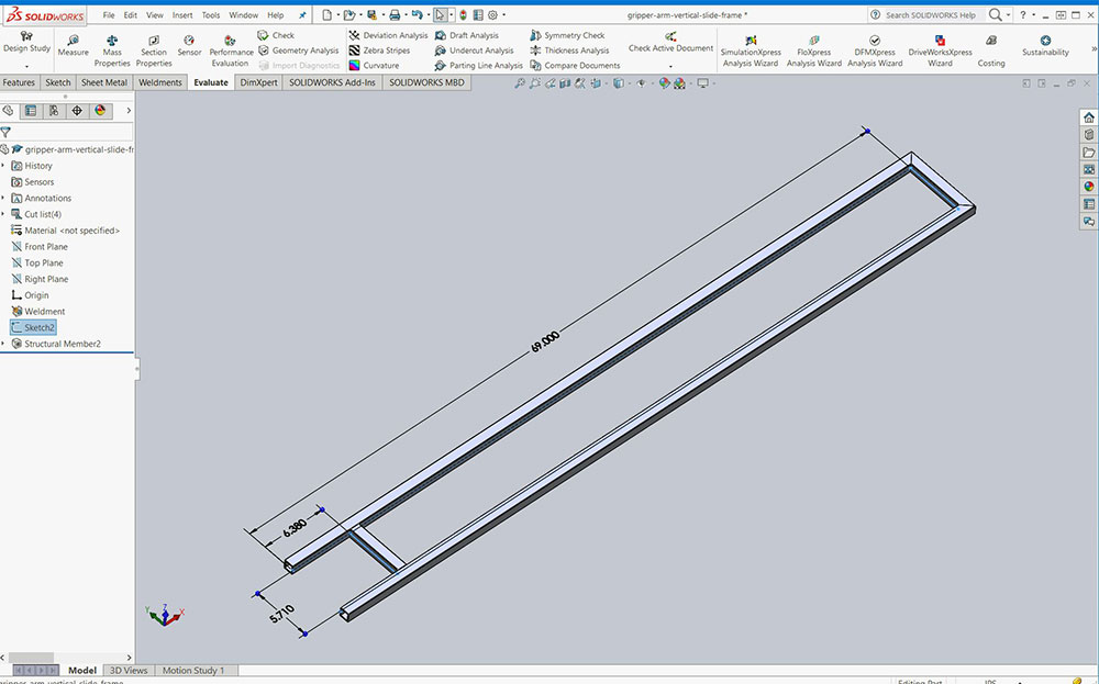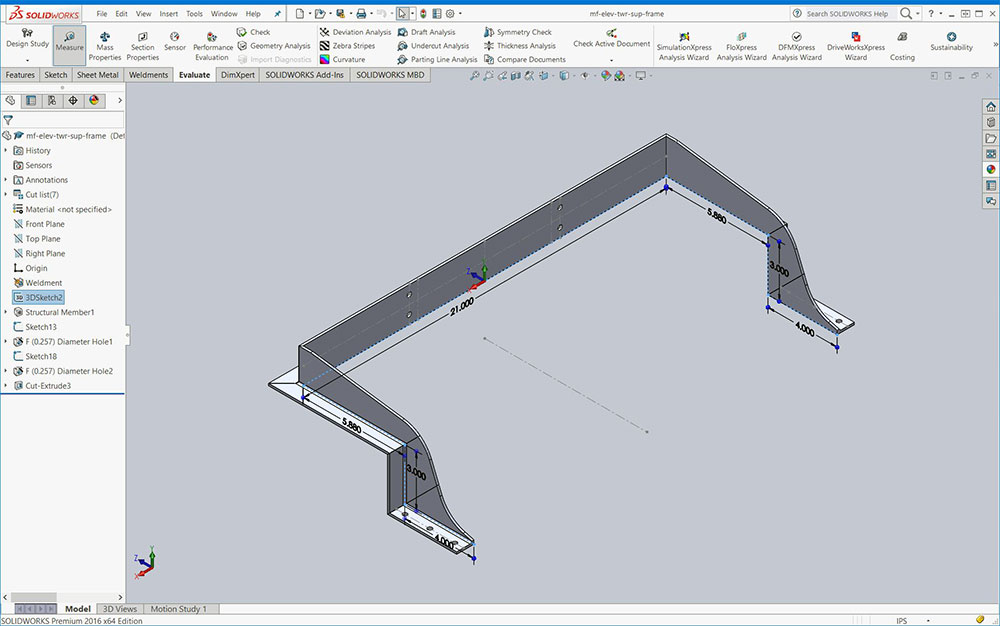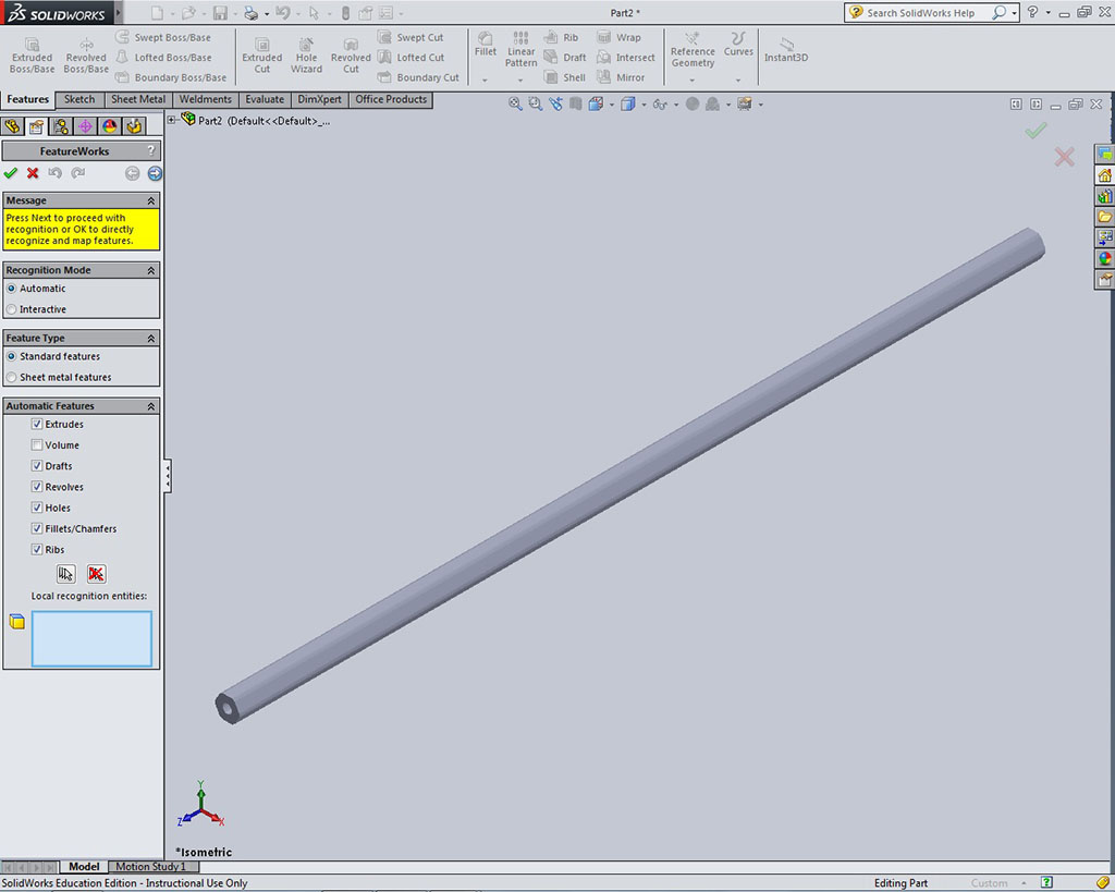 Note, this does not always work if there is a technical problem reading the STEP file. When the tutorial was done below, there was no problem creating a 2D weldment profile, but interestingly with the upgrade of the operating system from Windows 7 to Windows 10, Solidworks now, will not recognize the features, therefore now it is not possible to do it with the same part file. Never the less, the process below can be applied to any part that can be recognized using SolidWorks FeatureWorks tool.