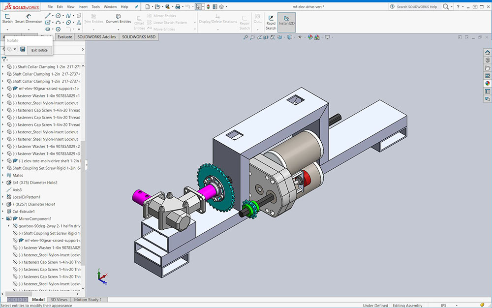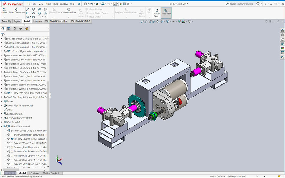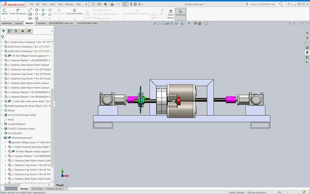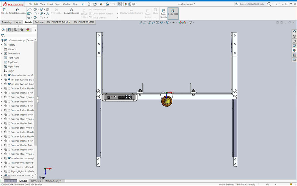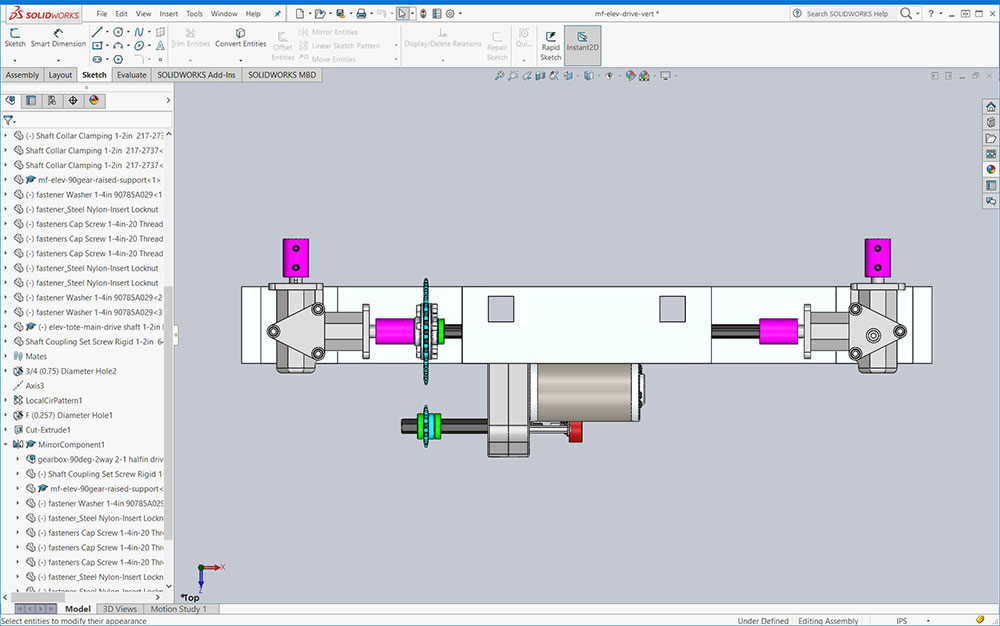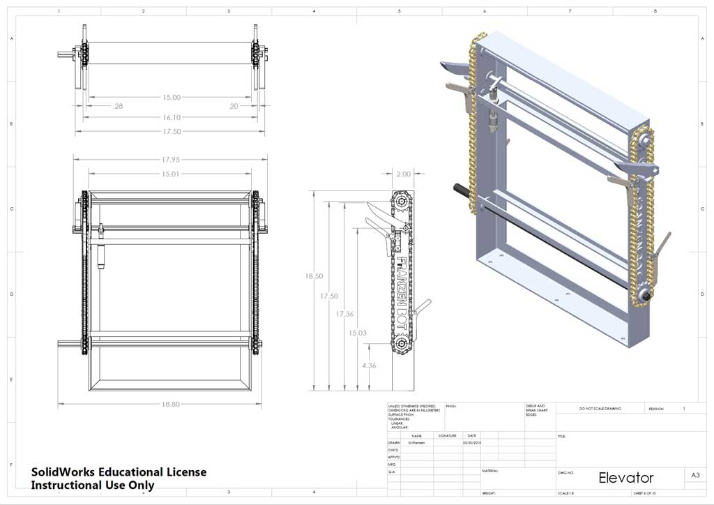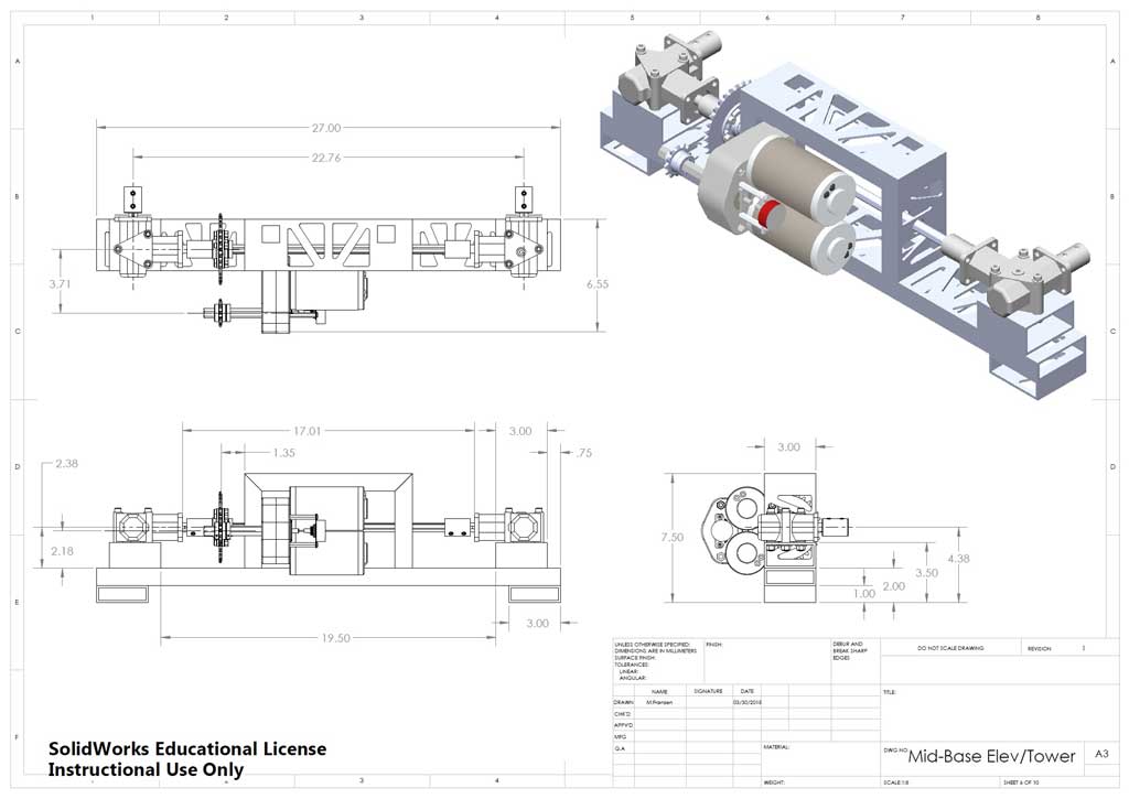 Remember to use the related eDrawing file found in your school class folder to see assembly and part details. Manufactured parts used should be in the school networked share CAD folder library. Below are the basic steps to complete the elevator mid frame drive system.