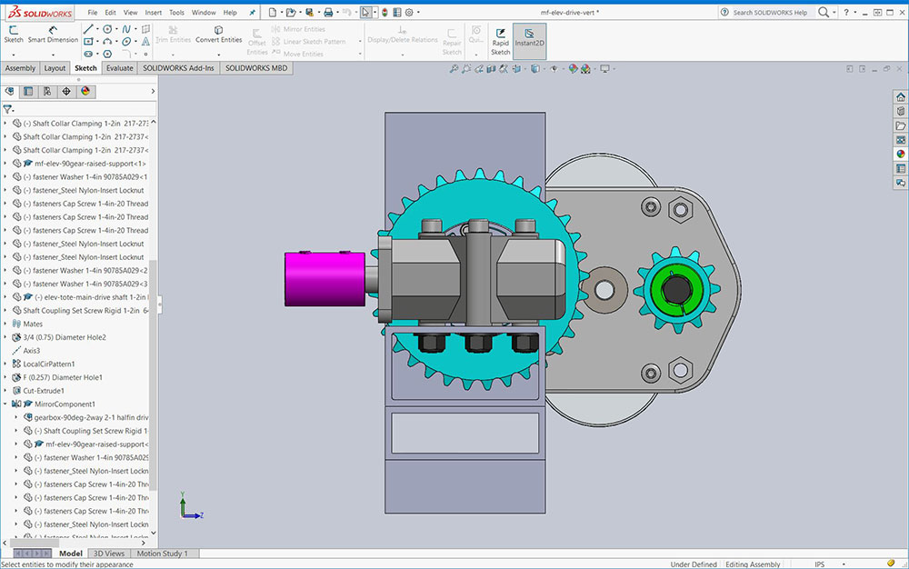 9. Add the two-way 90° 2:1 reduction ratio gear box assembly/part (does not need part recognition as no editing needed) on the one side and fasten first using the "Convert Entities" tool to line up holes and torx cap bolts washer and nylon hex nut (Note, you will mirror the other one later as shown)