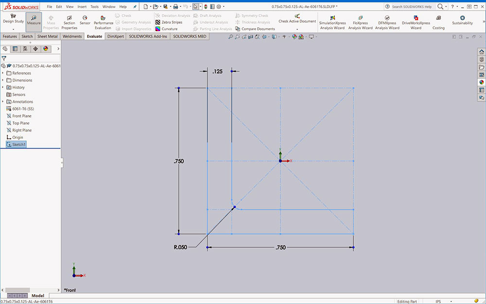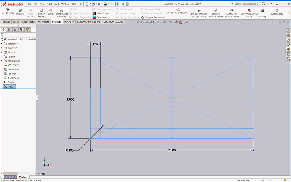 2. Using your already made 2.0x1.0x0.125-AL-Au-6061T6.SLDLFP profile, create the pneumatic air tank mount bracket