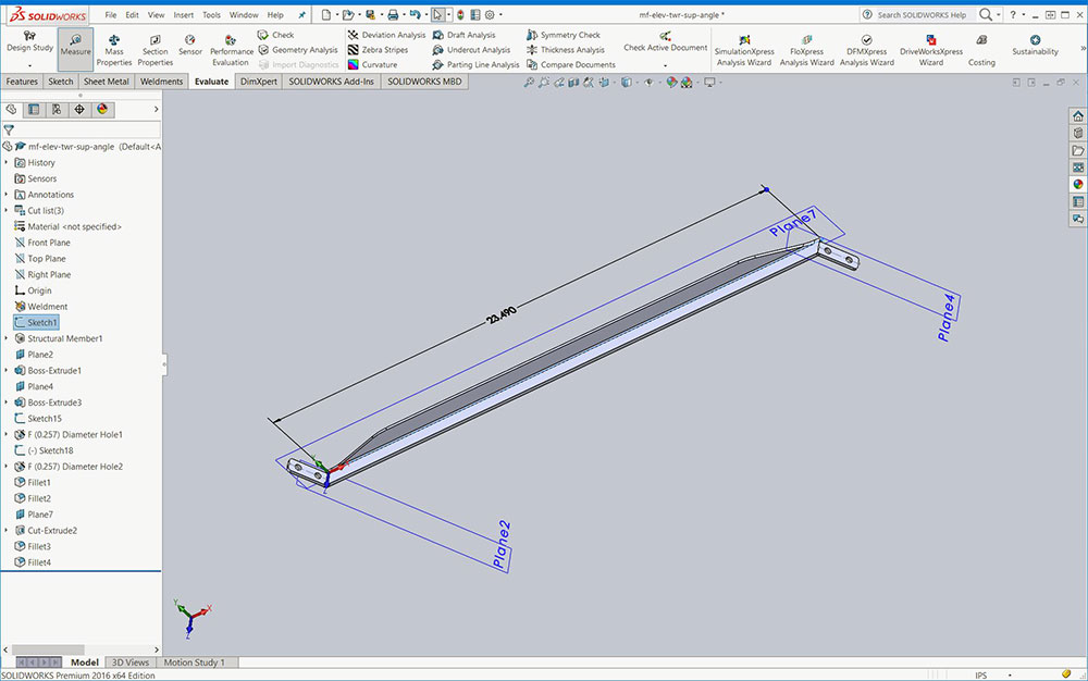 3. Create the other diagonal angle support piece weldment profile: 0.75x0.75x0.125-AL-Ae-6061T6.SLDLFP to make the diagonal vertical elevator support piece to be used on both sides. You may notice to make this diagonal angle support piece, three new planes were made to align the top and bottom angle fastening ends