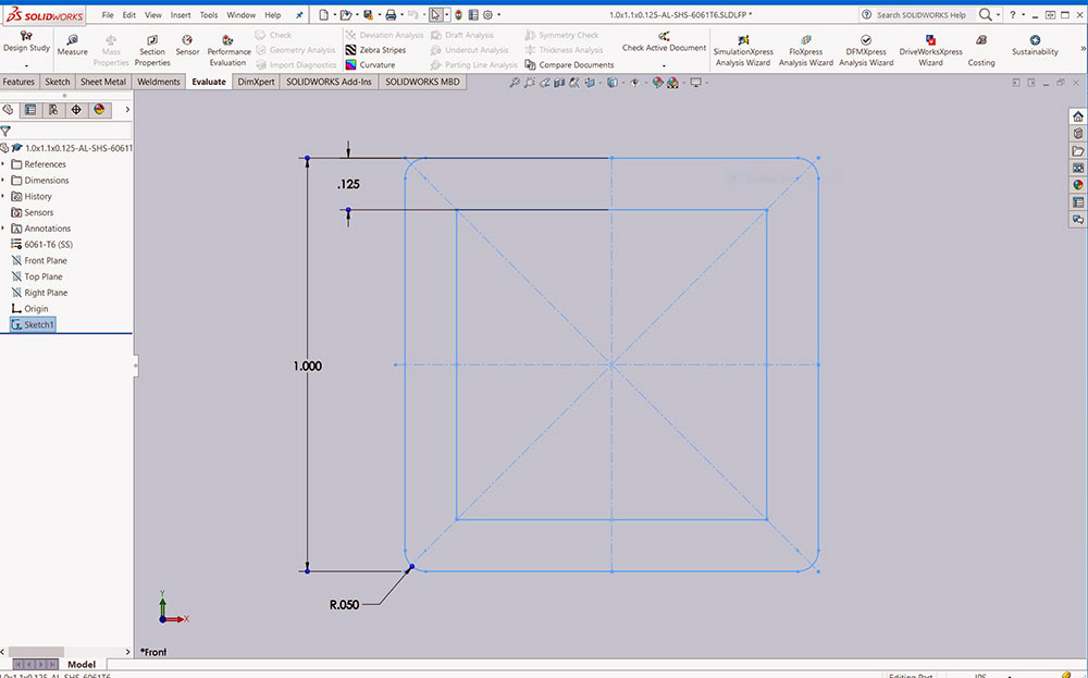 1. Create a square hollow section (SHS) profile: 1.0x1.1x0.125-AL-SHS-6061T6.SLDLFP