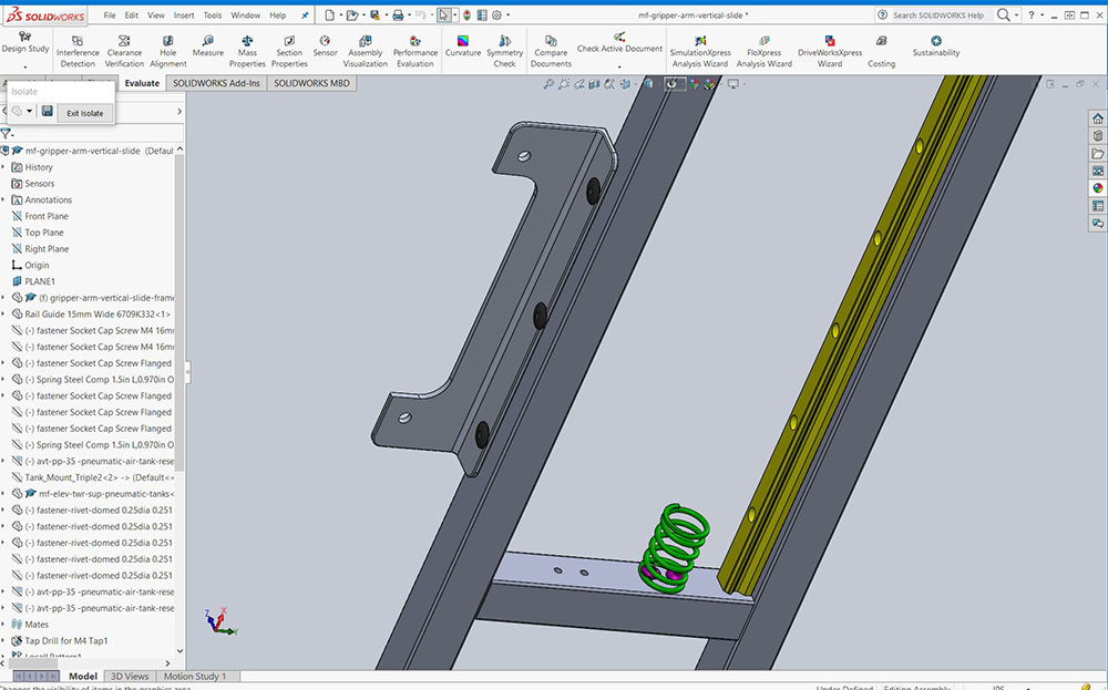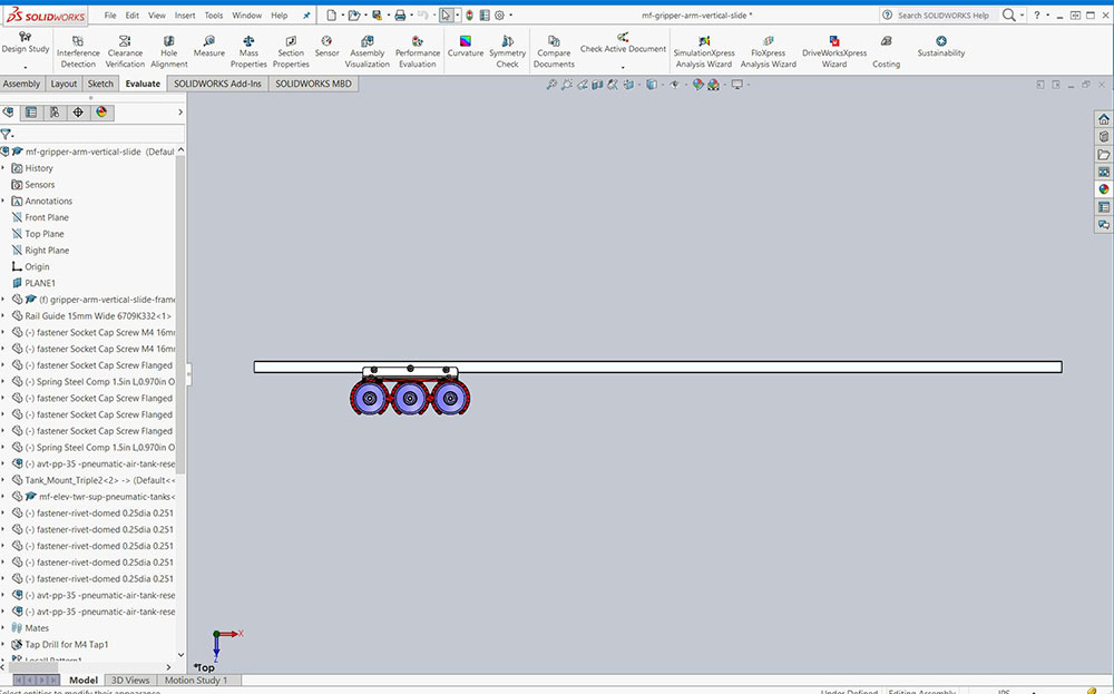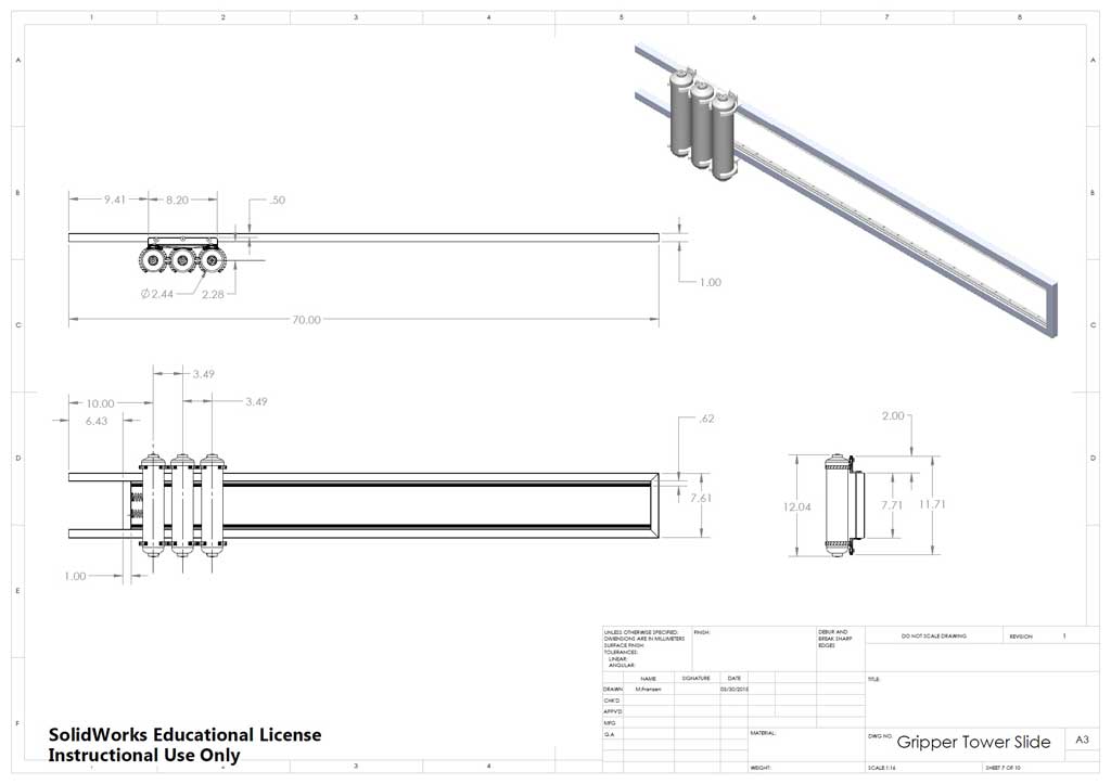 Remember to use the related eDrawing file found in your school class folder to see assembly and part details. Manufactured parts used should be in the school networked share CAD folder library. Below are the basic steps to complete the gripper tower slide.