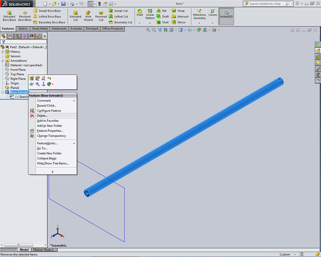 7. First start by removing the Boss Extrude feature by right clicking in the tree on it and select delete