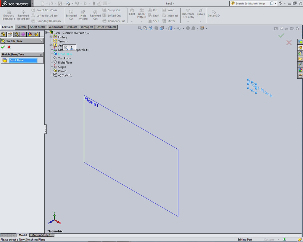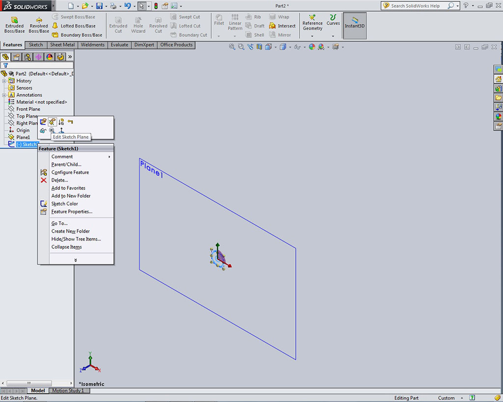 9. To move sketch from plane 1 to front plane, ensure the sketch you want to move is below the plane prior to selecting the sketch, then right click on it and select the Edit Sketch Plane icon