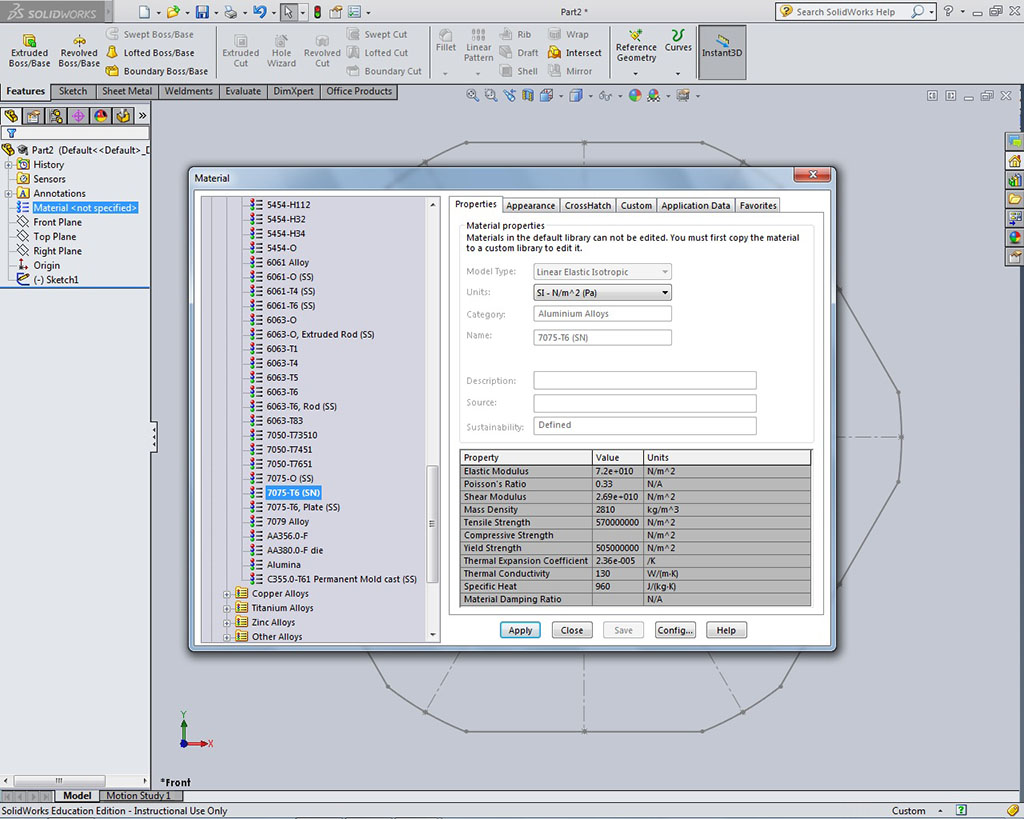 21. Add material type in the feature manager tree, by right clicking and selecting edit material type, the add specific material, in our case, aluminum 7075 t6