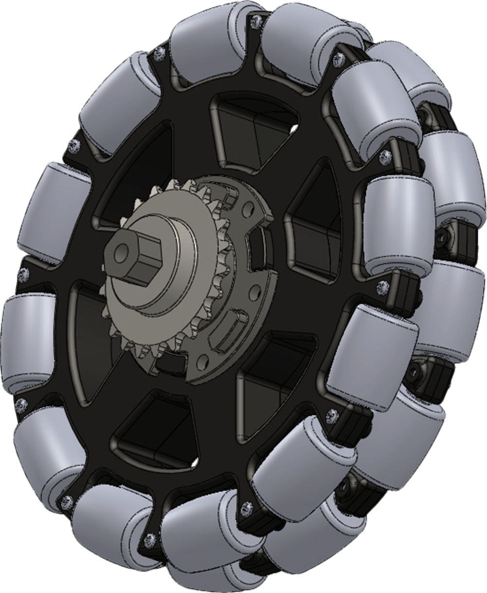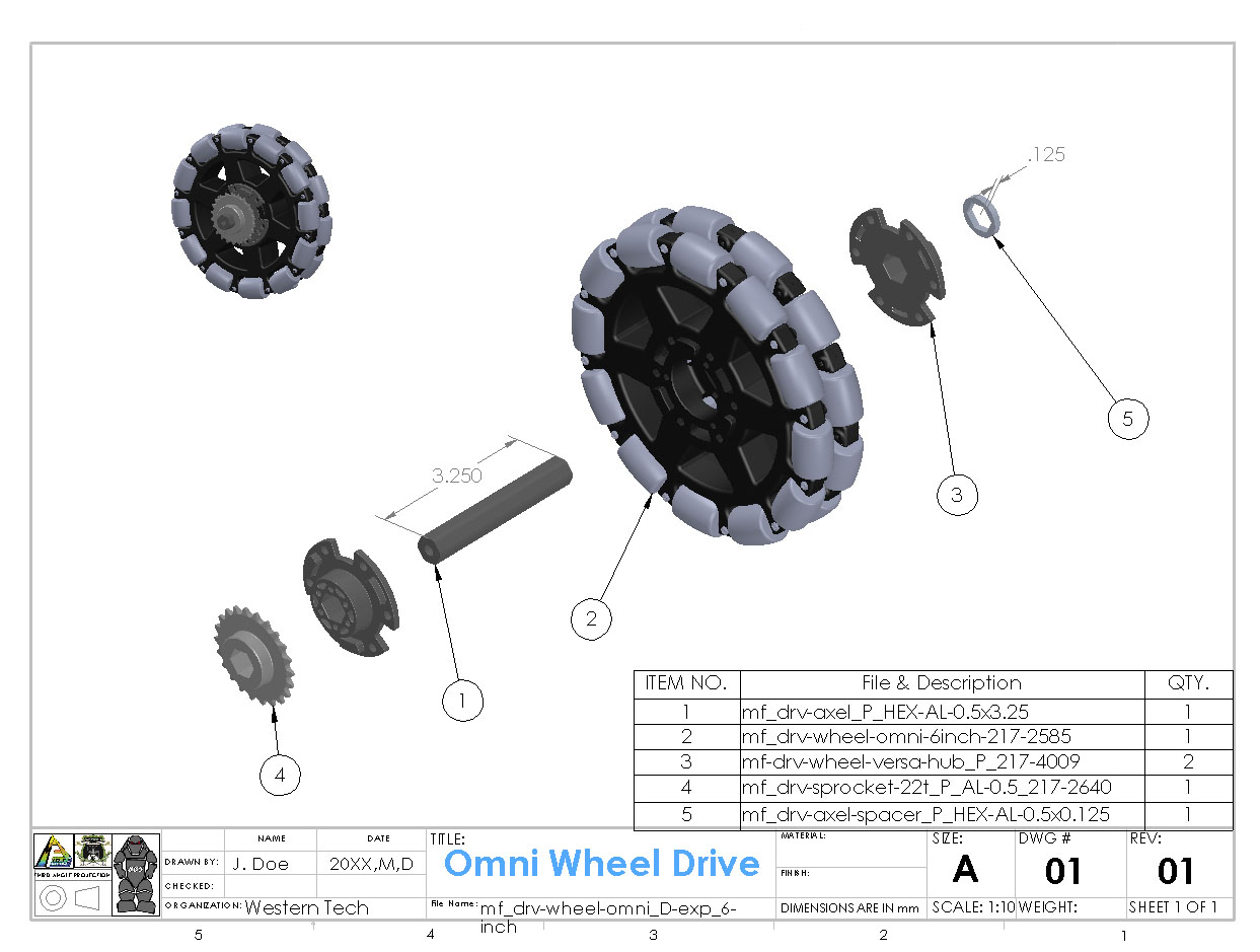 • Omni assembly exploded - wheel, shaft, sprockets, hub, spacers with balloon and BOM,