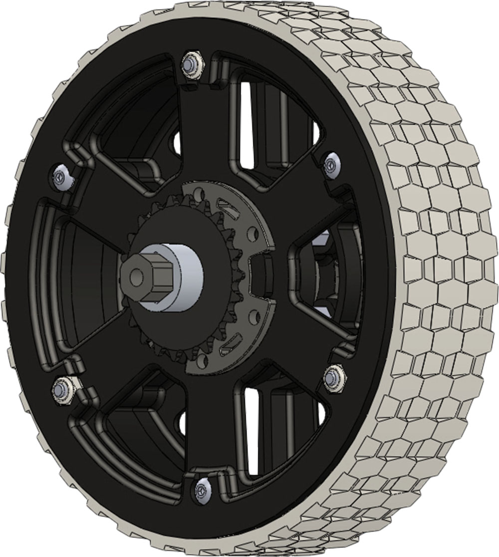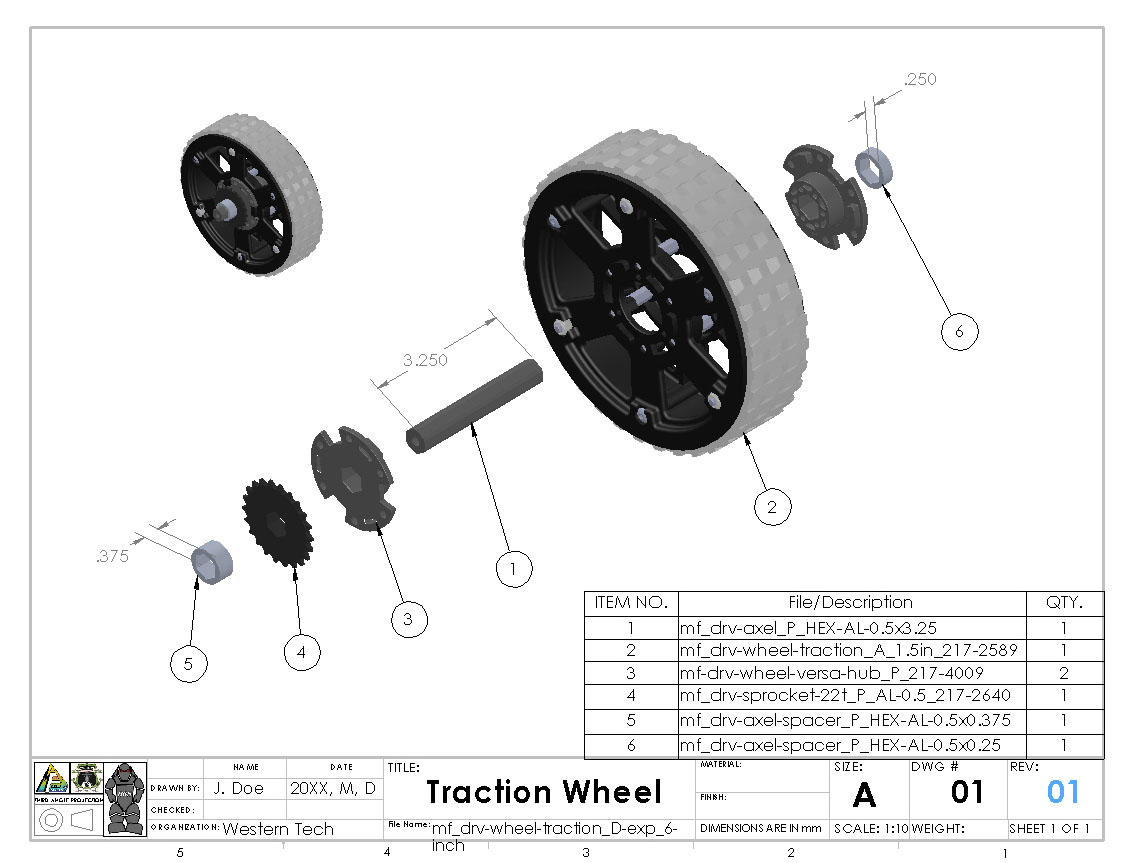 • Traction assembly exploded - wheel, shaft, sprockets, hub, spacers with balloon and BOM