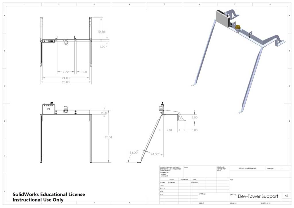 Remember to use the related eDrawing file found in your school class folder to see assembly and part details. Manufactured parts used should be in the school networked share CAD folder library. Use folder/file use and naming conventions, name features in feature tree, add the summary information, properties, and material for each custom part made.