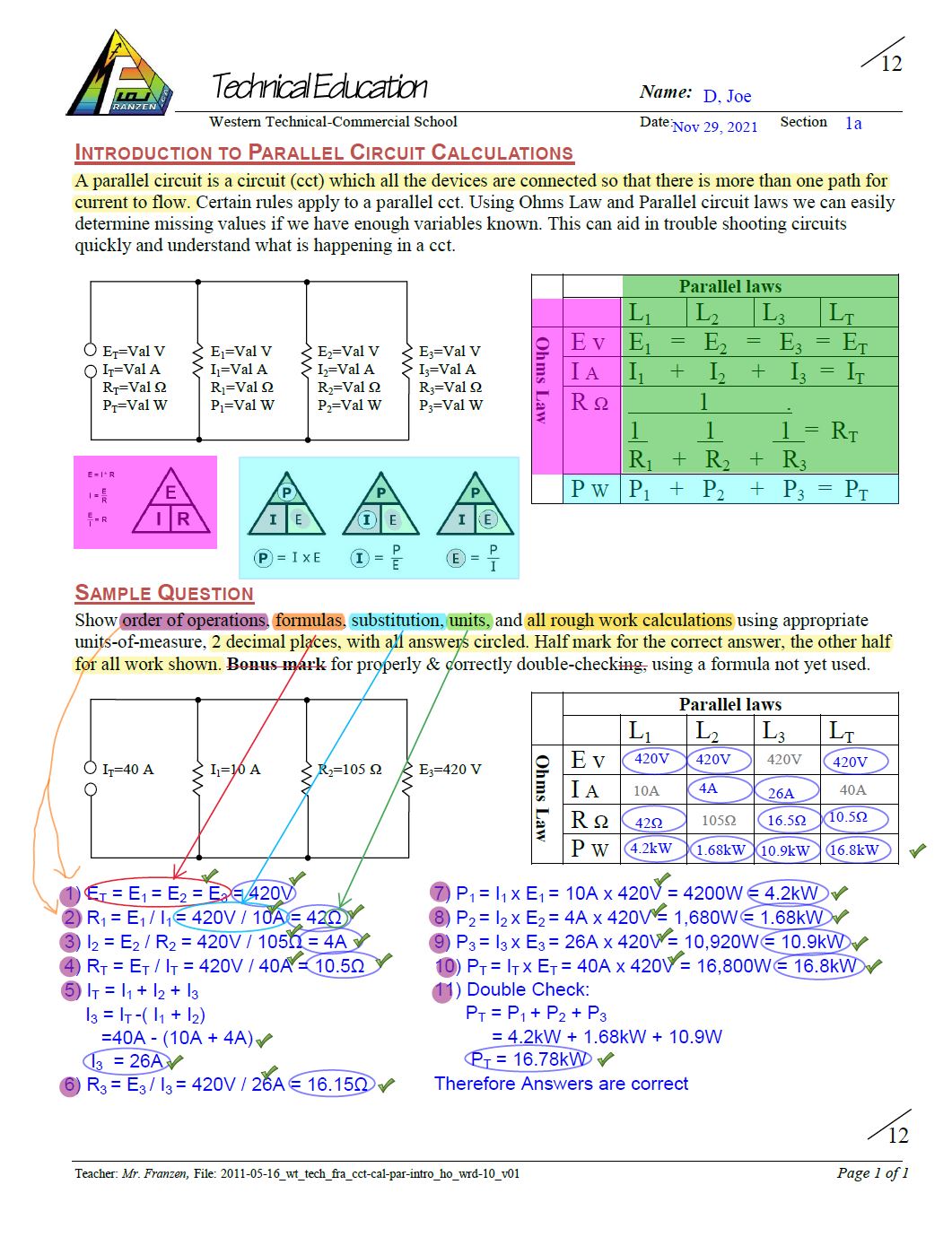 - Start with the Parallel Intro Sample sheet handout and copy the calculation answer format down with pencil. The image to the left can be enlarged to see it up close. Pay close attention to the steps and how the circuit was completed. Note all work must be shown when doing these calculations to get full marks, as fifty percent of the mark goes towards showing the process i.e. your steps in how you calculated your answers.