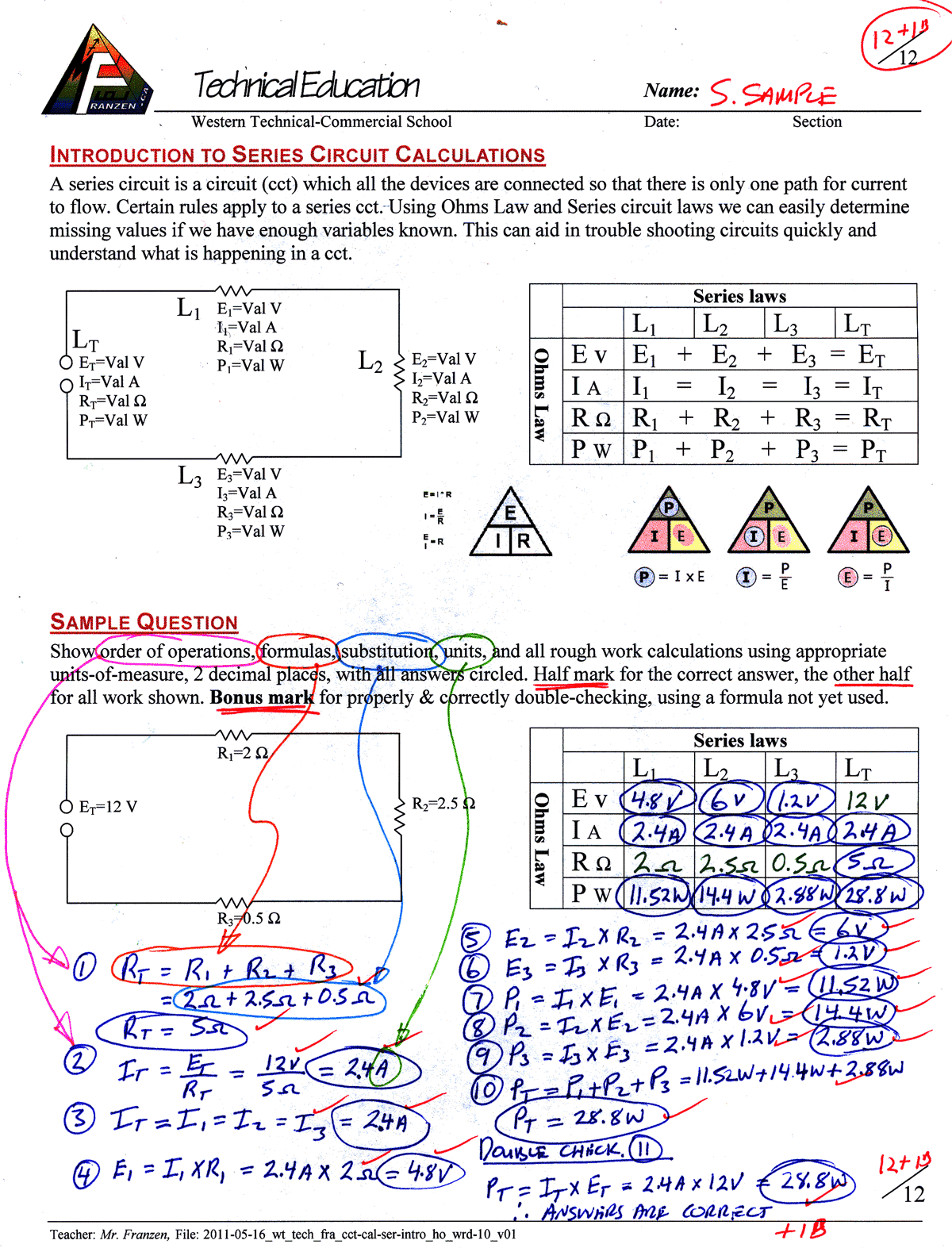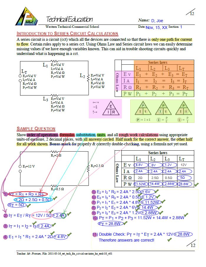 - Start with the Series Intro sheet handout and copy the calculation answer format down with pencil. The image to the left can be enlarged to see it up close. Pay close attention to the steps and how the circuit was completed. Note all work must be shown when doing these calculations to get full marks, as fifty percent of the mark goes towards showing the process i.e. your steps in how you calculated your answers.