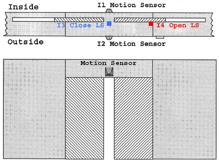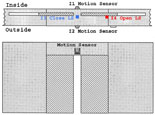 When a person approaches the automatic door, either the inside and/or outside sensor will open the doors. Once doors are open and open limit switch changes state, 4 seconds must past before the door starts to close. If a person steps into range of inside/outside sensors, door will stay open until 4 seconds after they are gone out of range. Once 4 seconds times out with no one around, door will close. If one of the motion sensors picks up movement, the door must immediately stop closing and open up again and hold open again for an additional 4 seconds , then attempt to close again. When closed, the closed limit switch will change state, and close motor will stop. Automatic door waits until next person.