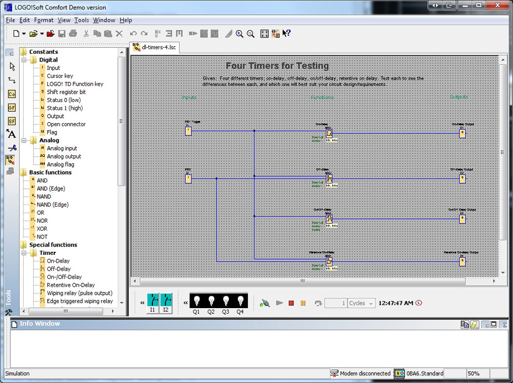Each circuit must have a centred header with a title, name, and detailed description of the circuit requirements and operation, and include the three major sections of the circuit sub-titled: Inputs, Functions, and Outputs. Circuits are to be handed in both a LOGO!Soft Comfort Drawing file .lsc and an exported .jpg