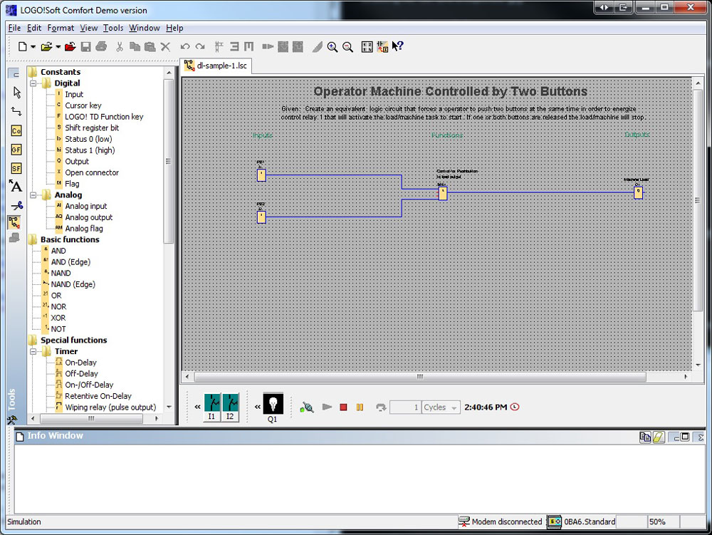 Using Siemens LOGO! Soft Comfort software with digital logic, build a circuit that will work similar to a standard stop-start motor control circuit. Once you have this done, you will be familiar with the program operation and the latch mechanism you used, in order to also create a similar motor control circuit, Forward/Reverse Motor Control Circuit.