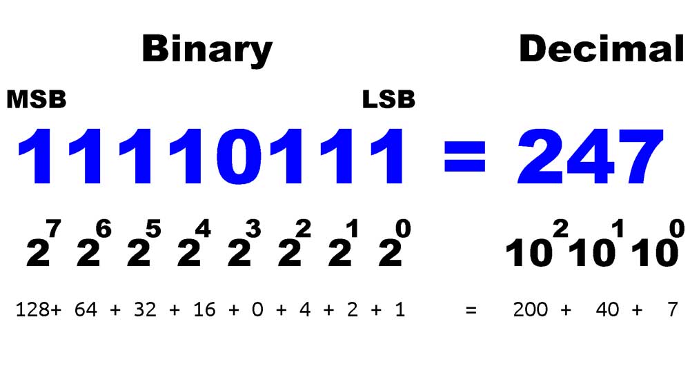 Binary to decimal (radix or base 2 to base 10) and vice/versa, conversions are needed because working with very long binary numbers are hard to read/write and therefore commonly converted. Understanding the conversion methods also helps with understanding how and why data is used in this form. Not to worry, there are a lot of online calculators to convert, add, subtract, etc., knowing this process gives a better understanding of number systems and their relations. There are several examples in detail, in the resource links provided below, but a quick explanation is below for converting from Binary to Decimal and Decimal to Binary below.