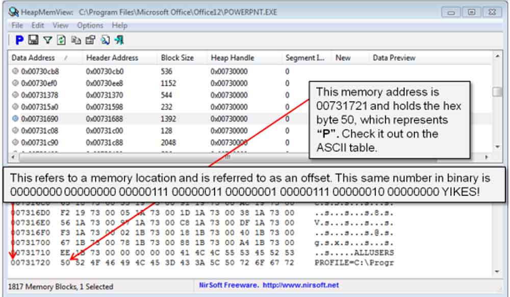 Oct for short is a numbering system that represents 0-7 while Hex for short, is an efficient numbering system widely used in to represent 1's and 0's in the computer data world. Hex could represent colours, memory, IPv6 and MAC addresses as examples. A sample memory dump image to the right shows an example of hex numbering system being used. As you know a binary byte is 8 digits, but a hex byte number is only 2 digits in length where a decimal byte (1-255) can be 1 or 3 digits long. Additionally, an ASCII Code table can be referenced to find out what each of the characters represent. Remember hex represents 0-9, A-F (0-15 in decimal), so for example 0xF + 0x1 = 0x10, or 0xF + 0x2 = 0x11, where the Ox (Hash # and/or dollar sign $ also may be used) is common to represent actual hex, so you can't mix it up with binary digits. So 11 binary is decimal 3, but 0x11 in hex is decimal 17. A sub-script can also be used to represent either oct8 or hex16 also.