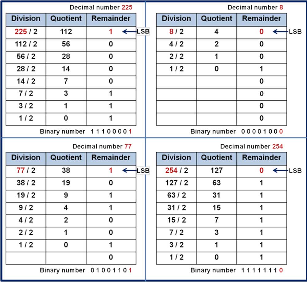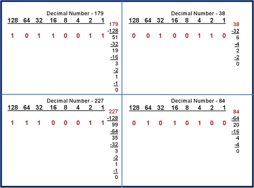 There are methods that can be used, the process of elimination or the divide and conquer methods. Working with a byte size (maximum decimal value of 255 which is 11111111 or 128+64+32+16+8+4+2+1=255), the process of elimination method, by comparing the decimal number with the MSB (128). If your number is larger than or equal to 128 then place a 1 under the 128 column, subtract 128 from your number and move to the next position (64). However, if your number is less than 128 then place a 0 under the 128 column and move to the next number (64) without subtracting. A second method, divide and conquer, you just divide your decimal number by 2, with the remainder used as your LSB, 1 or a 0, then continue to divide and repeat.