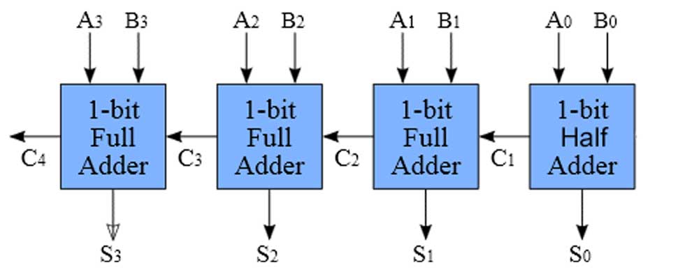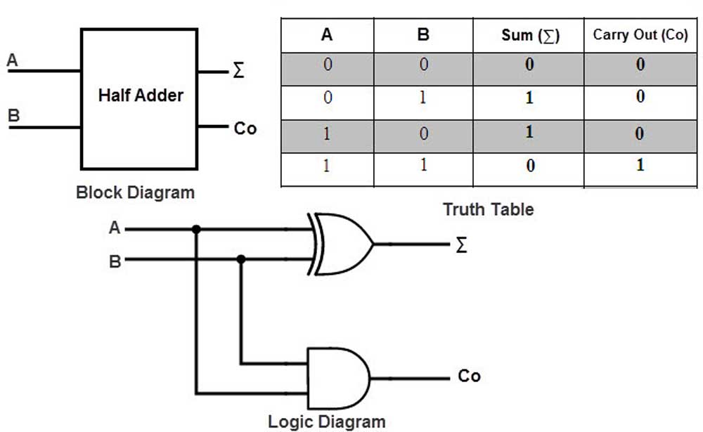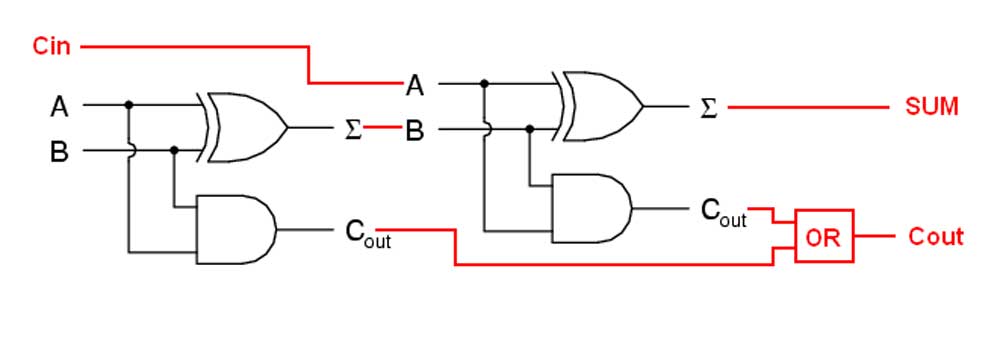 By combining two half adders and also an OR to take the carries from both of the AND's from each half adder, the output carry will continue to output properly resulting in a full adder circuit. A full digital adder performs addition two one bit numbers and an input carry. To perform more than one bit addition, a parallel adder must be used for adding all required bits simultaneously. In a parallel adder circuit there is no carry at the least significant position, therefore you can use either a half adder or make the carry input of full adder to zero
