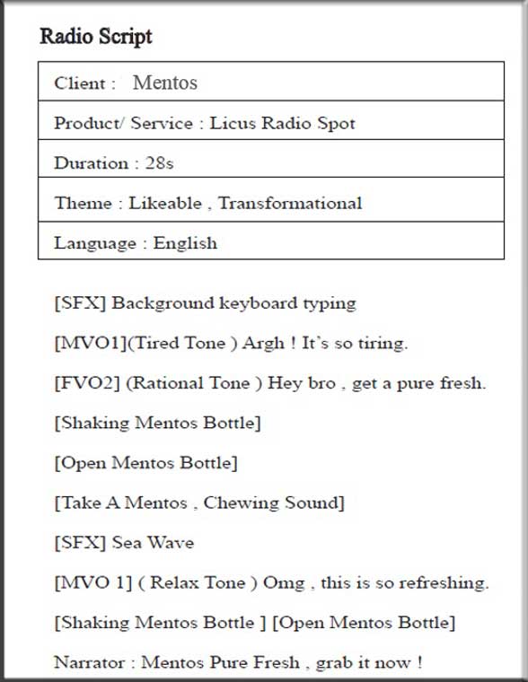 scripting sheet HO. You will need to add what you will be saying, your slogan, music track, sound clips, and special effects that you plan on using to create your radio ID Ad. You should work/focus on each radio Id separately, so start with the short radio Id. It will be important to rehearse several times to get your best consistent spoken word performance great sounding when you do the recording.