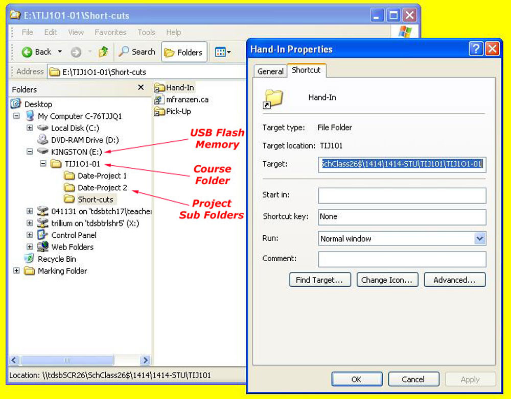 Next you will need to get a USB memory stick, for saving your work on to. You will need to follow instructions on the tech info page to create three shortcuts inside a main folder with your course code, and a sub-folder Shortcuts.: