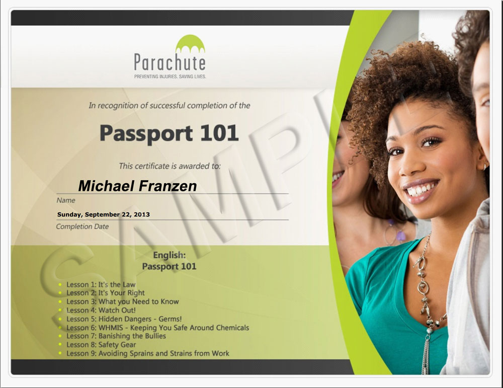 To start, go to the main Passport to Safety page and click on quick register and enter the registration code you received from your teacher, fill in your information and you will receive an e-mail with your username and password to login with and get started. . A tutorial with quiz questions will allow you to earn your safety passport certificate which you can use in your portfolio/ resume. Ensure you keep your user name and password safe for future access when needed.