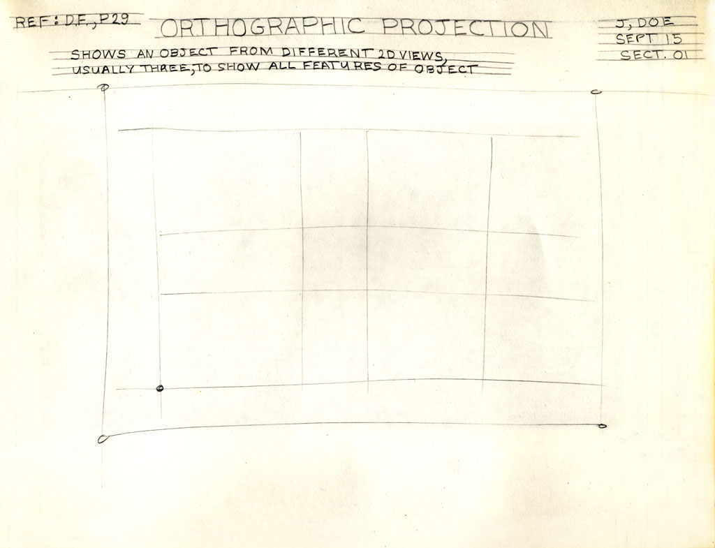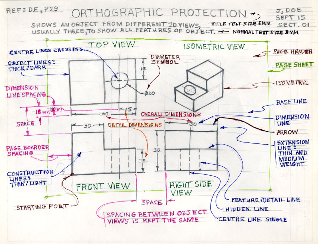 - Using a full blank page, start drawing the layout, then add the dimensions, and then label all the related terms associated orthographic projected views and dimensioning.