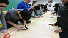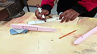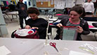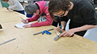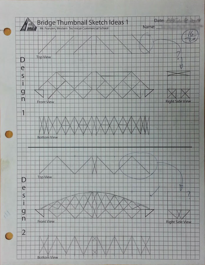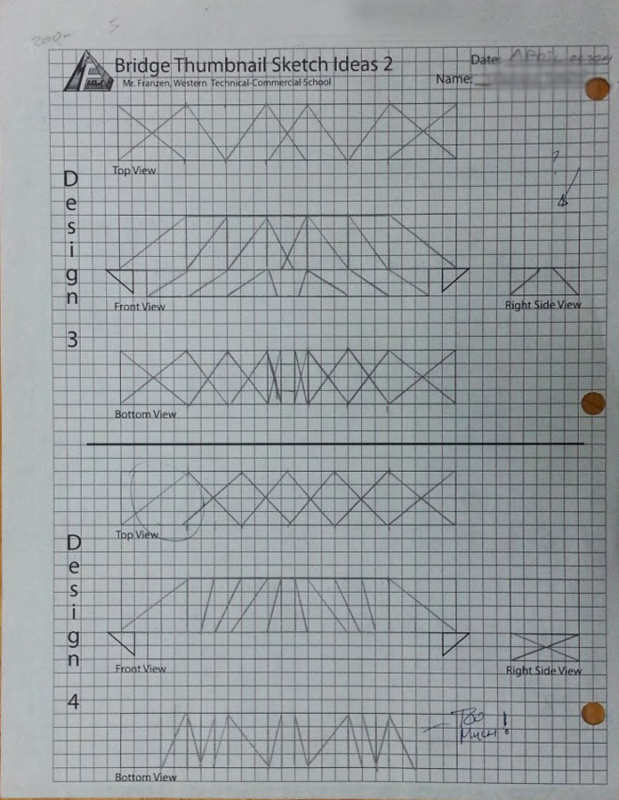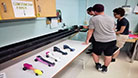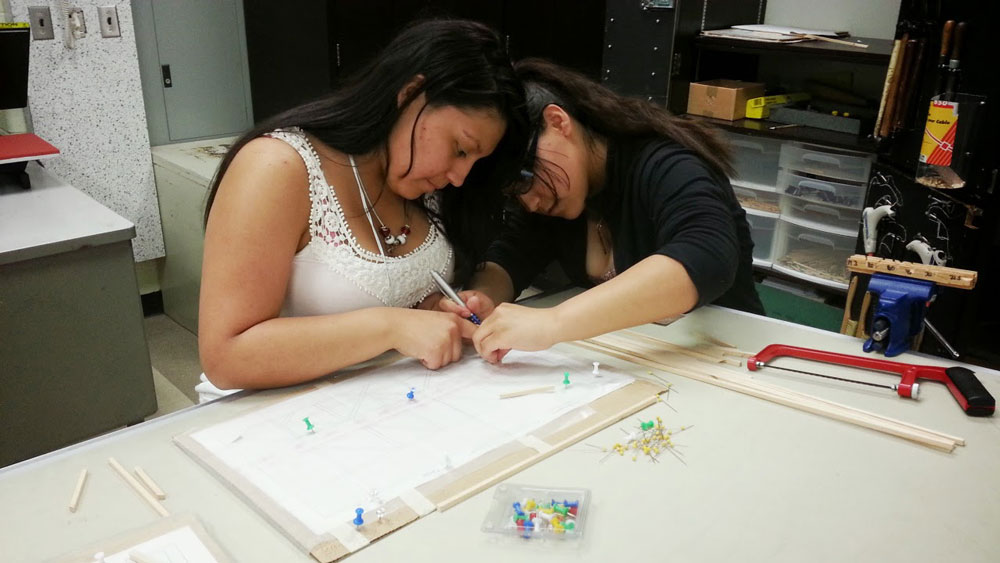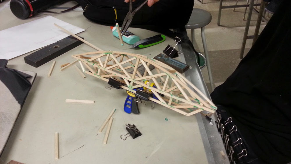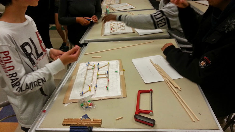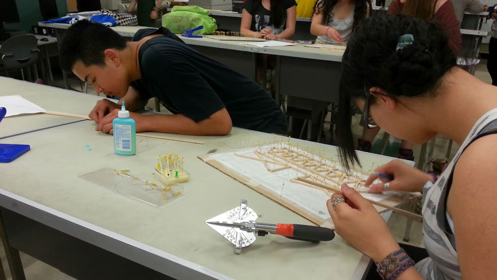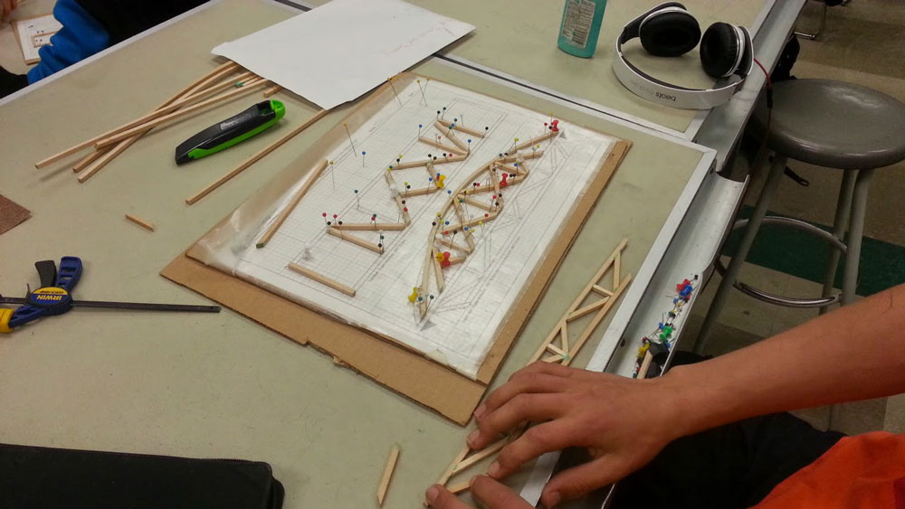 Bridge design, build, and test was first started by researching what makes a great bridge, then sketching ideas, next draw it on Illustrator to scale, then then print the bridge design on paper and use that design to cut and glue 5 mm by 5 mm bass wood pieces to make their bridge. Once built and tested, an evaluation was completed and their illustrated design was transferred on to a Western T-shirt as a souvenir to take home with them. Destructive testing followed using a progressive weight to centre of bridge span to see how much it could hold.