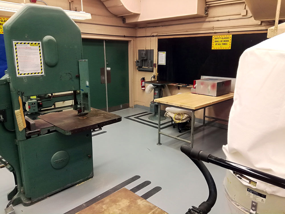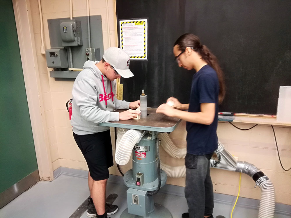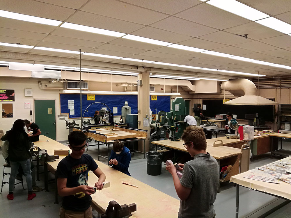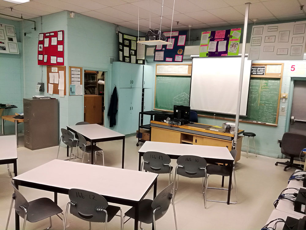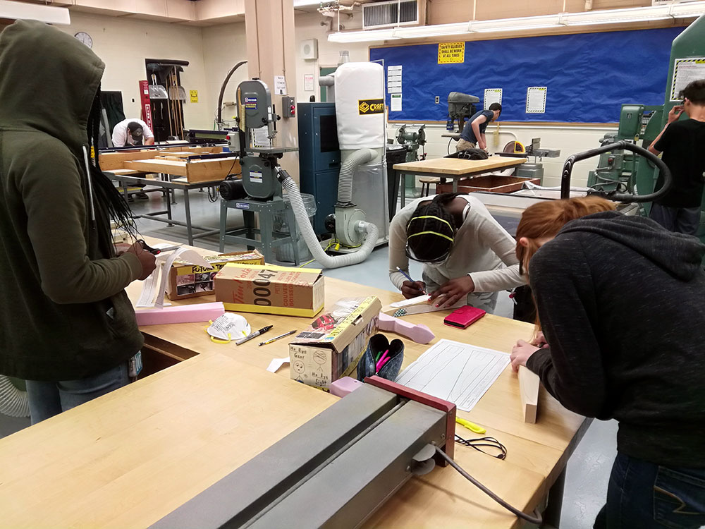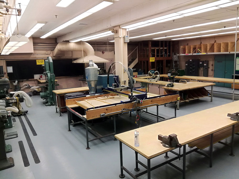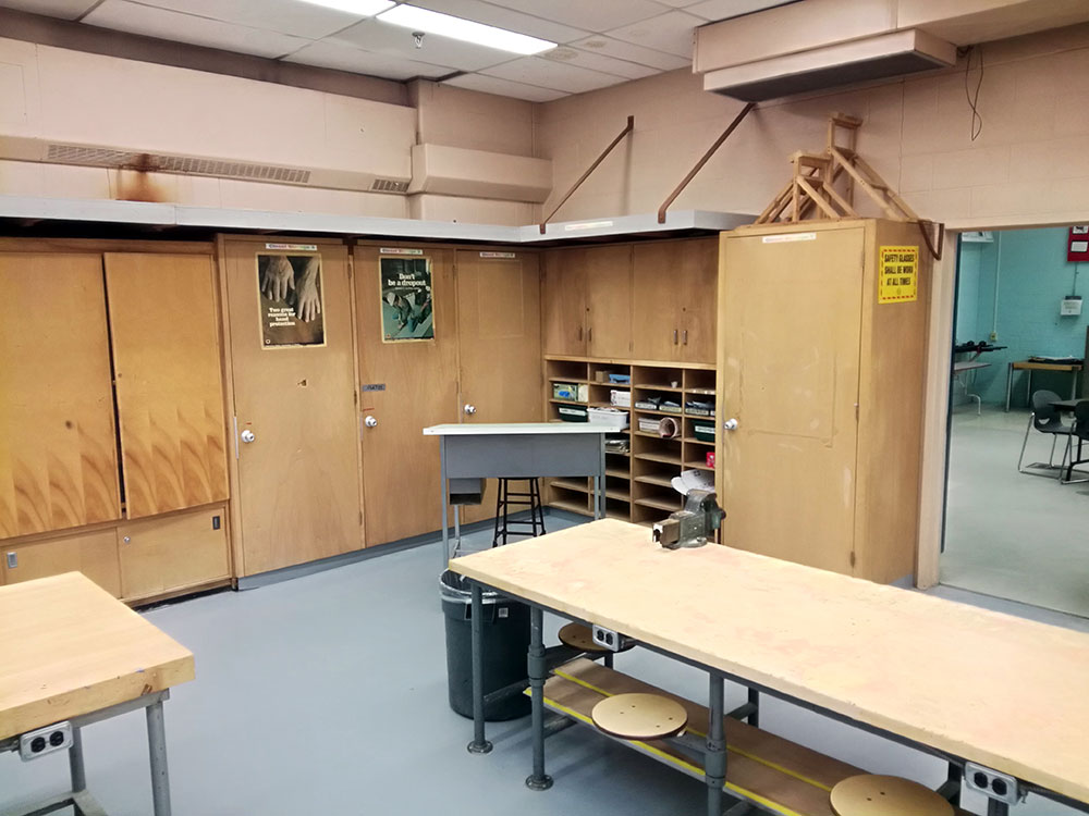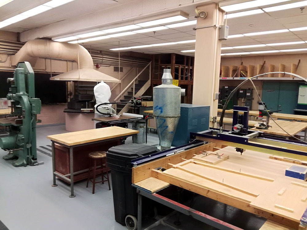 This program uses two adjoining rooms, a classroom and work shop. Both were revitalized in 2017-18 with equipment, tools, work benches, computers, and furniture. Students familiarize themselves with with the rooms and their resources. The classroom, room 166, consists of a theory area, computer lab, prototyping area, project testing area, Co2 dragster digital race track, wind tunnel, and library area. The work shop, room 165, consists of bench work areas, wood machines, table vices, multiple portable dust vacuums, CNC router, ventilated paint area, slop sink and Bradley Hand washing area, material shelves and cupboards, tool cabinets, and safety equipment resources - aprons, safety glasses, dust masks, hearing protection, eye wash station, etc. With both of these rooms, students use the resources to learn, research, design, build, and come up with solutions to given technological challenges. Techniques, process, tools, machines, computers, teamwork, co-operation all support students in this excellent, well organized and safe working environment/facility.