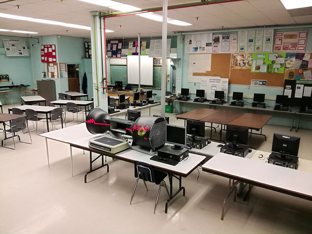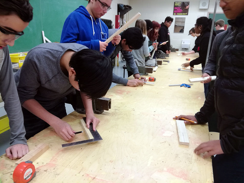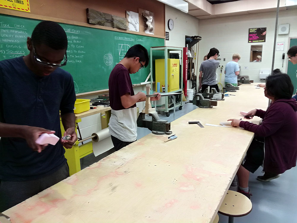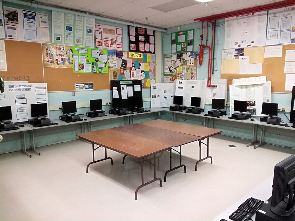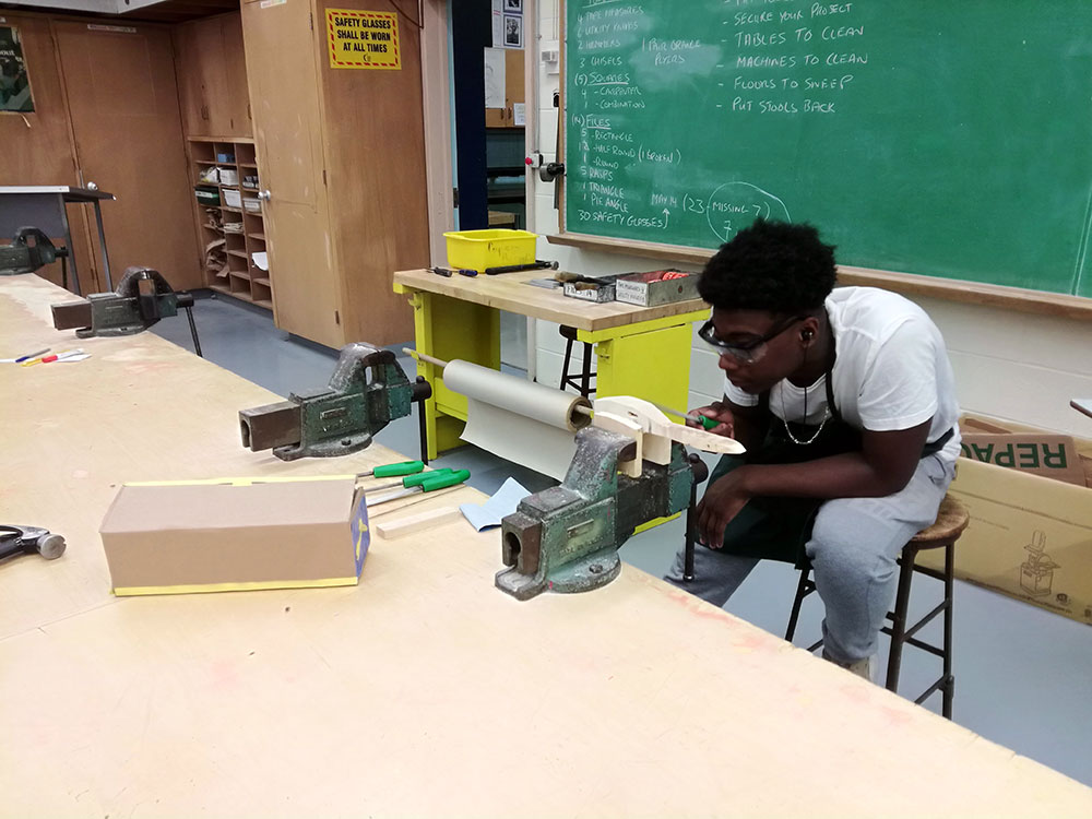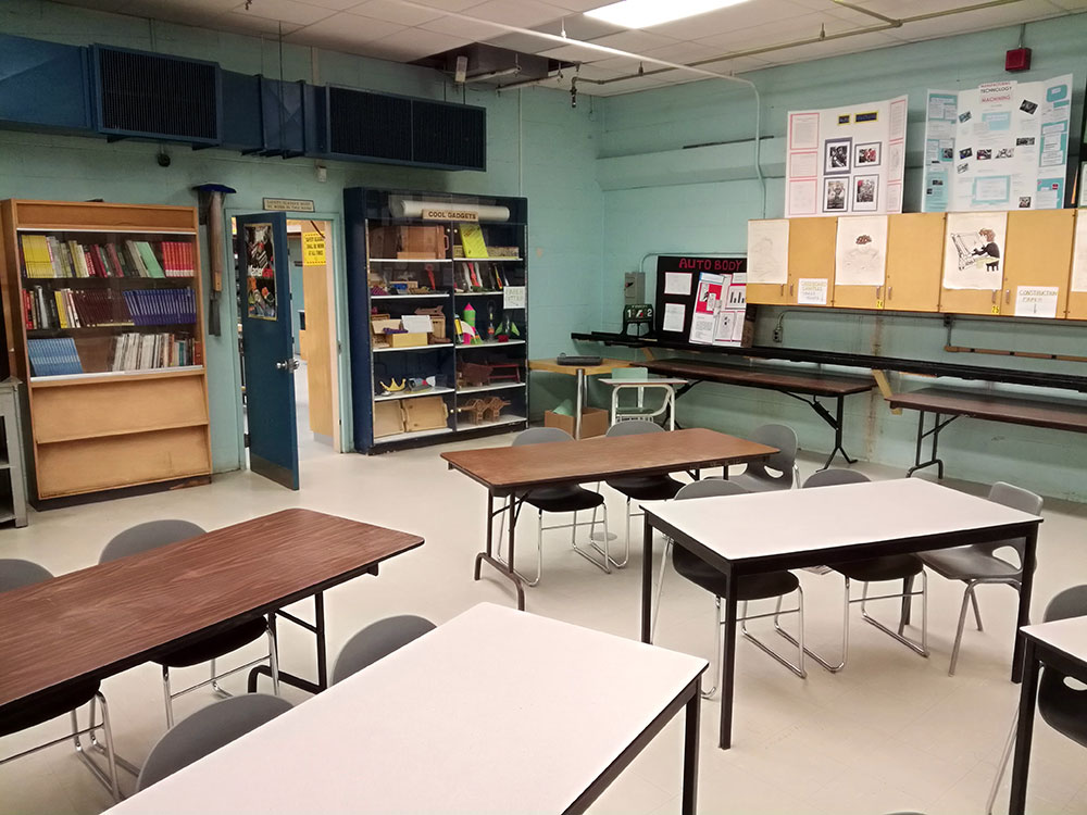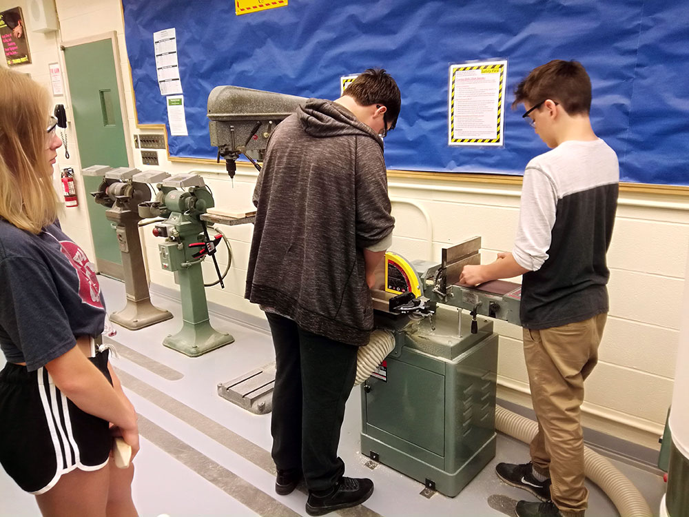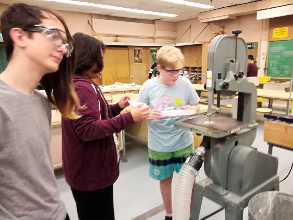 This program uses two adjoining rooms, a classroom and work shop. Both were revitalized in 2017-18 with equipment, tools, work benches, computers, and furniture. Students familiarize themselves with with the rooms and their resources. The classroom, room 166, consists of a theory area, computer lab, prototyping area, project testing area, Co2 dragster digital race track, wind tunnel, and library area. The work shop, room 165, consists of bench work areas, wood machines, table vices, multiple portable dust vacuums, CNC router, ventilated paint area, slop sink and Bradley Hand washing area, material shelves and cupboards, tool cabinets, and safety equipment resources - aprons, safety glasses, dust masks, hearing protection, eye wash station, etc. With both of these rooms, students use the resources to learn, research, design, build, and come up with solutions to given technological challenges. Techniques, process, tools, machines, computers, teamwork, co-operation all support students in this excellent, well organized and safe working environment/facility.