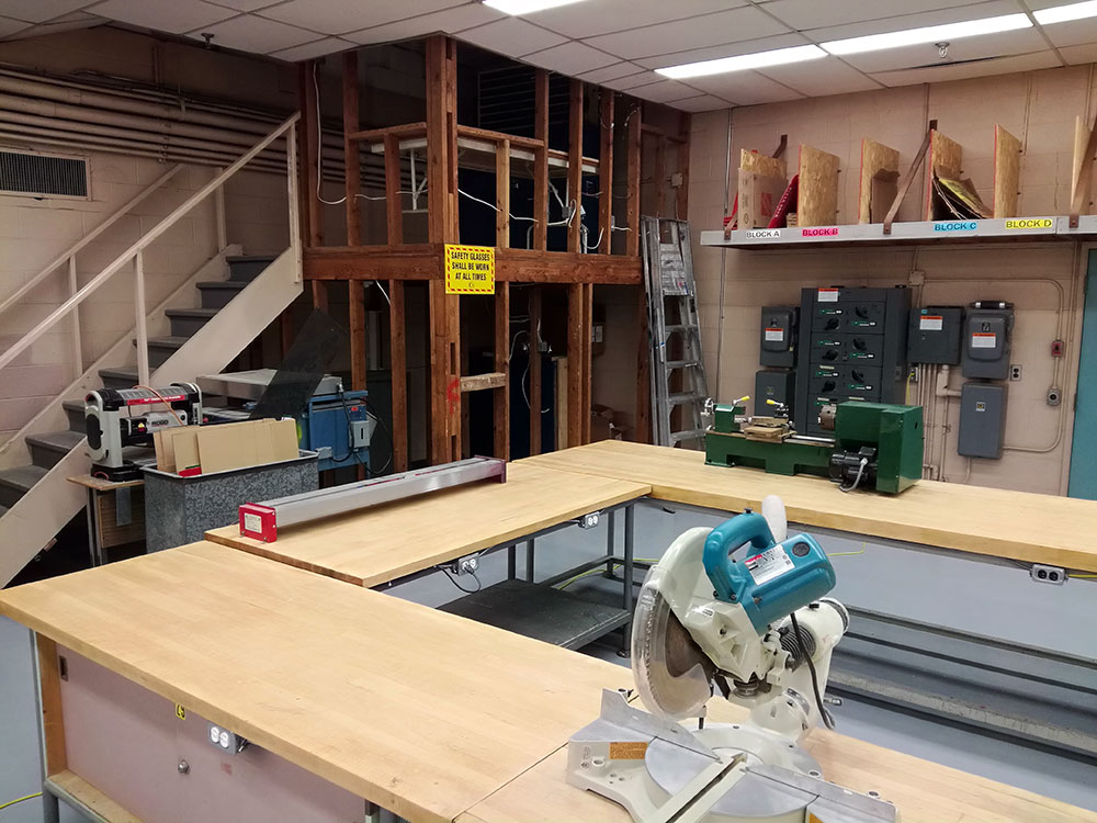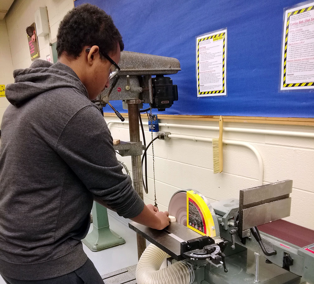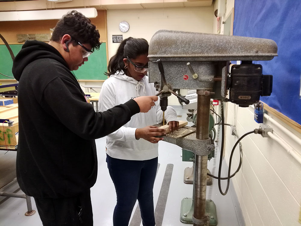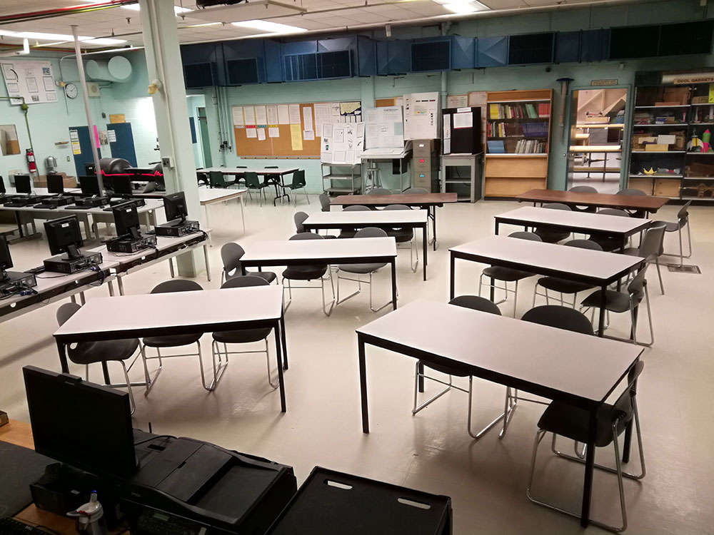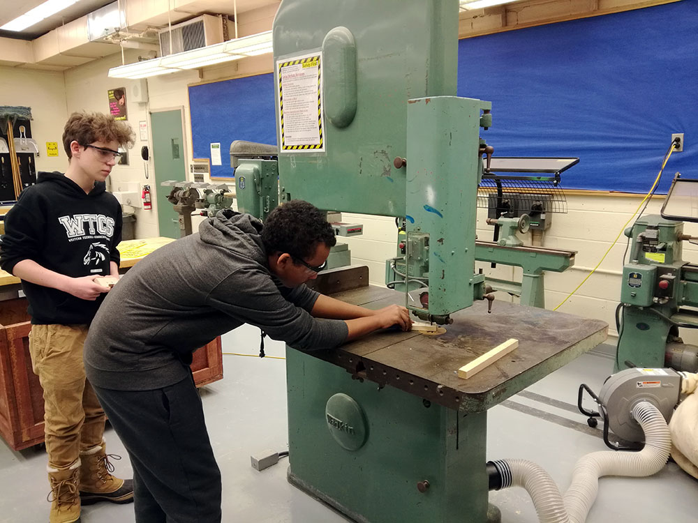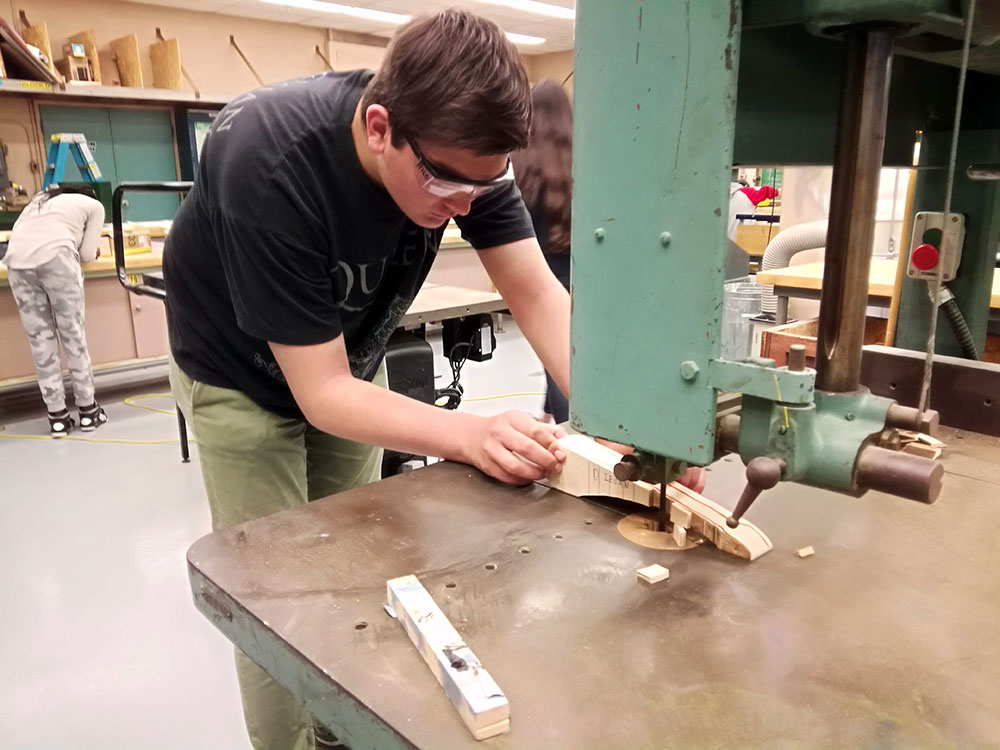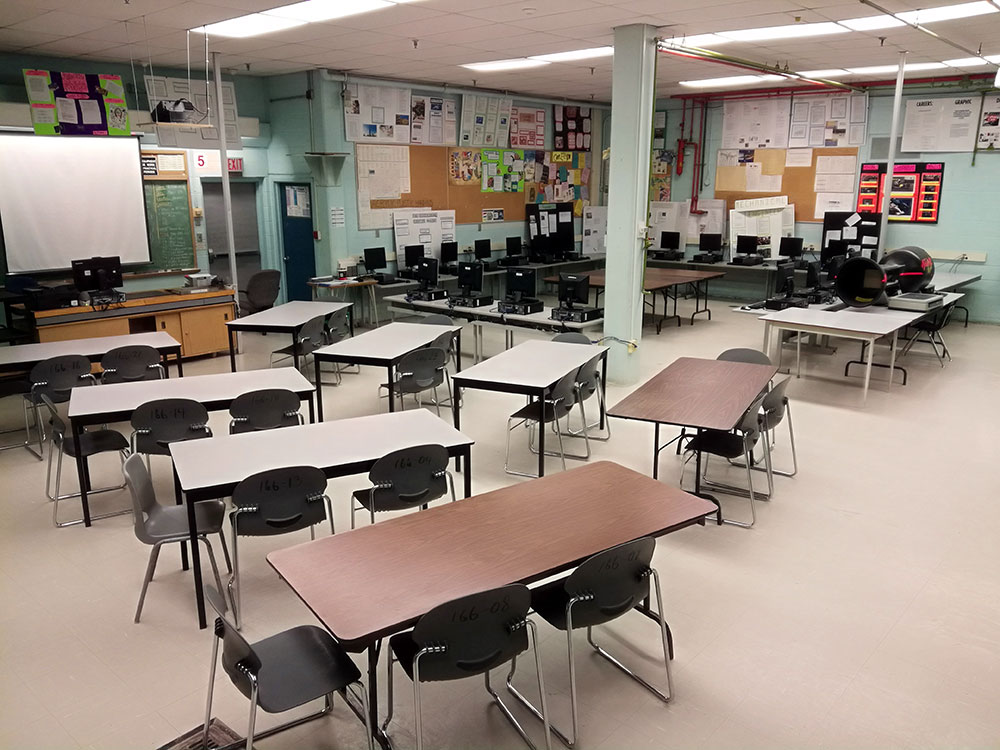 This program uses two adjoining rooms, a classroom and work shop. Both were revitalized in 2017-18 with equipment, tools, work benches, computers, and furniture. Students familiarize themselves with with the rooms and their resources. The classroom, room 166, consists of a theory area, computer lab, prototyping area, project testing area, Co2 dragster digital race track, wind tunnel, and library area. The work shop, room 165, consists of bench work areas, wood machines, table vices, multiple portable dust vacuums, CNC router, ventilated paint area, slop sink and Bradley Hand washing area, material shelves and cupboards, tool cabinets, and safety equipment resources - aprons, safety glasses, dust masks, hearing protection, eye wash station, etc. With both of these rooms, students use the resources to learn, research, design, build, and come up with solutions to given technological challenges. Techniques, process, tools, machines, computers, teamwork, co-operation all support students in this excellent, well organized and safe working environment/facility.