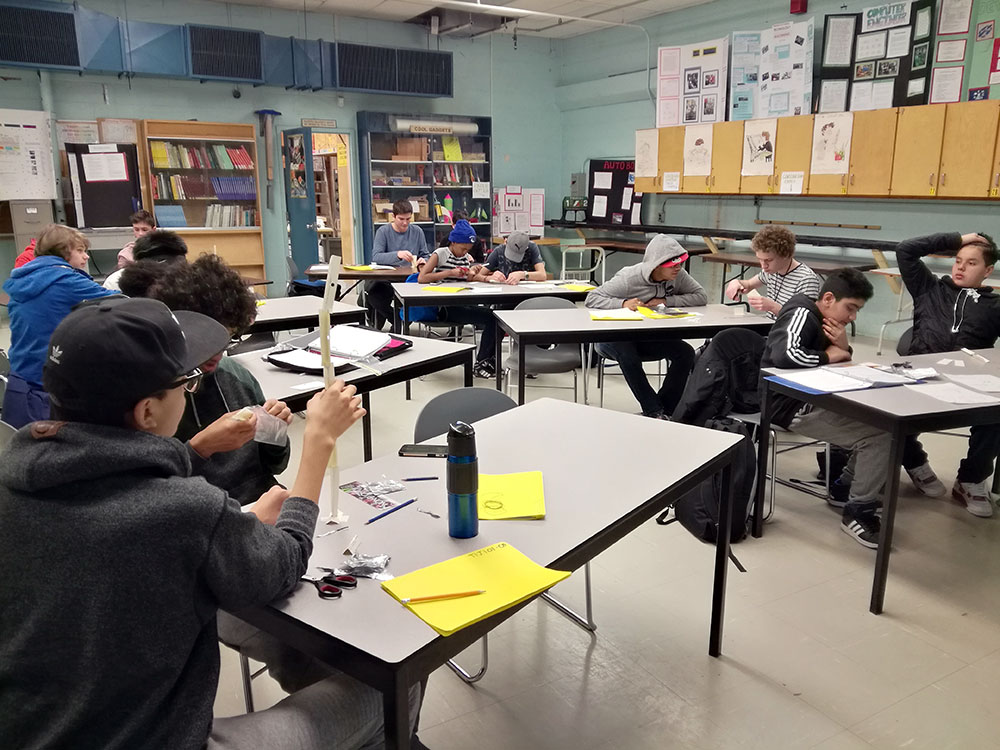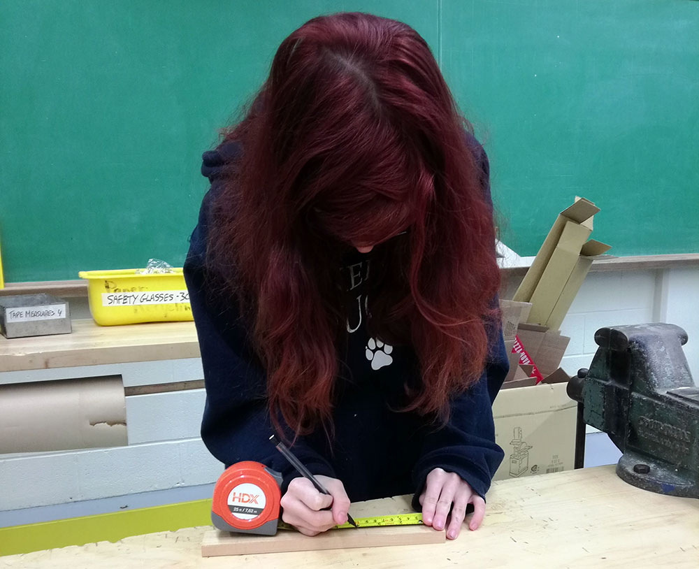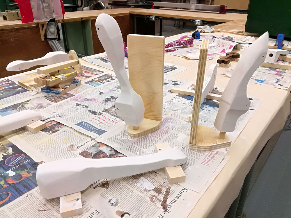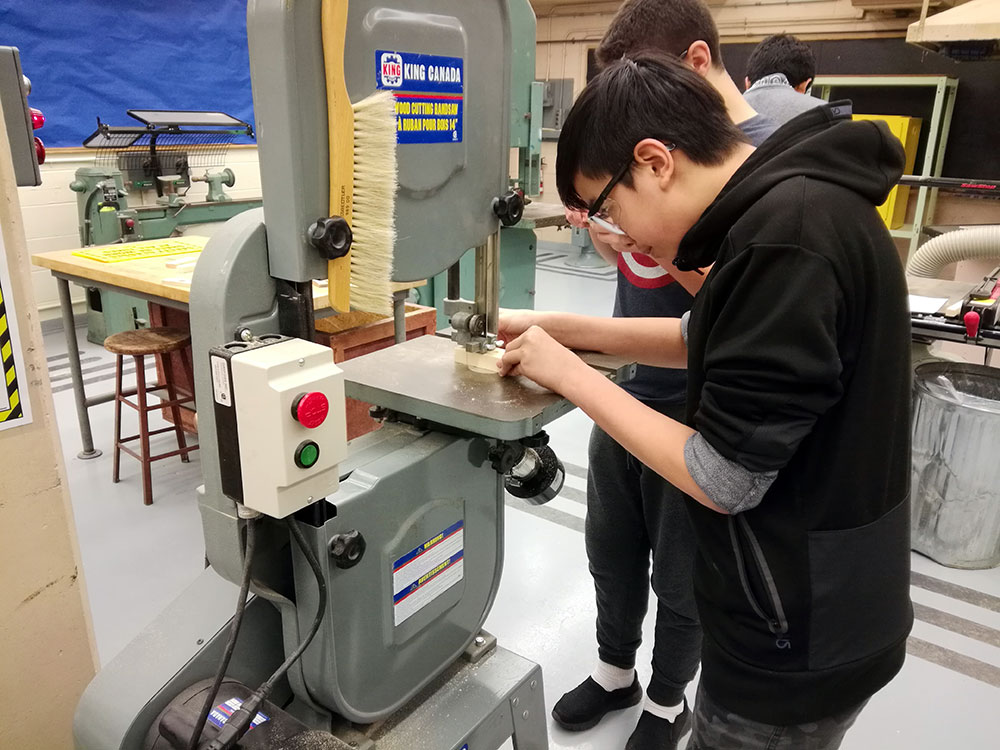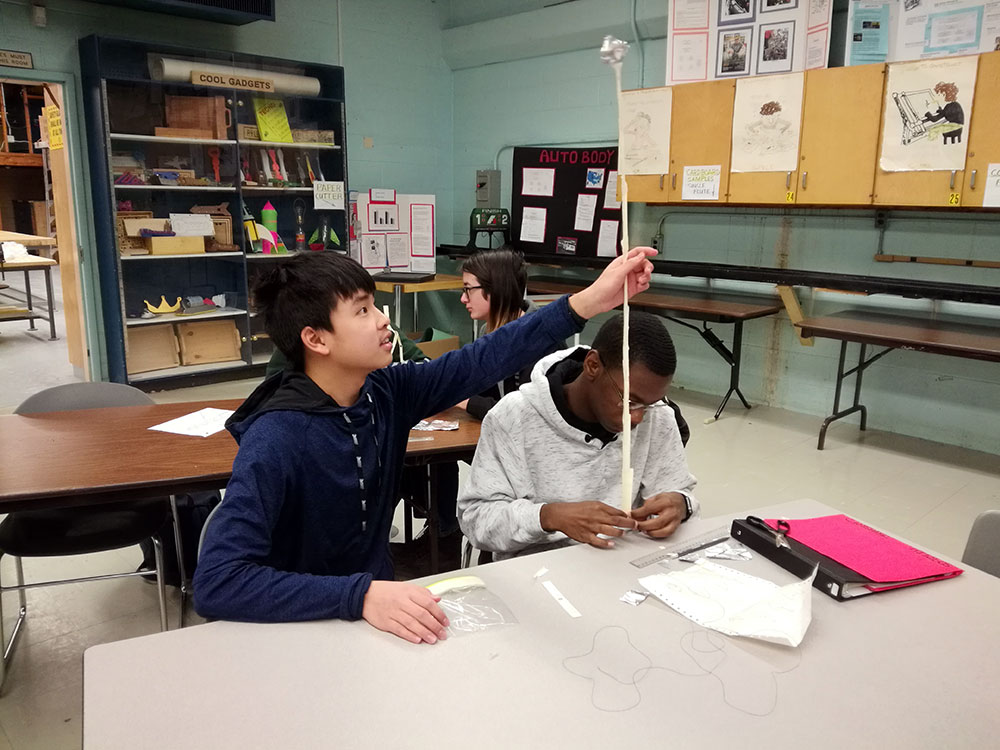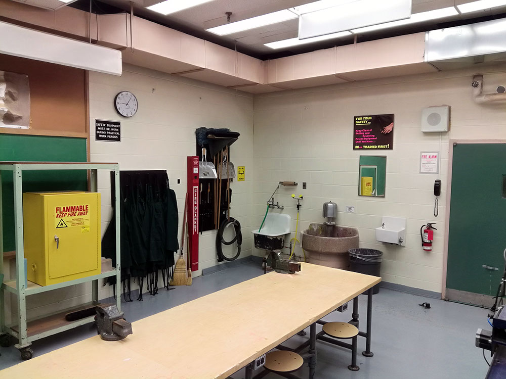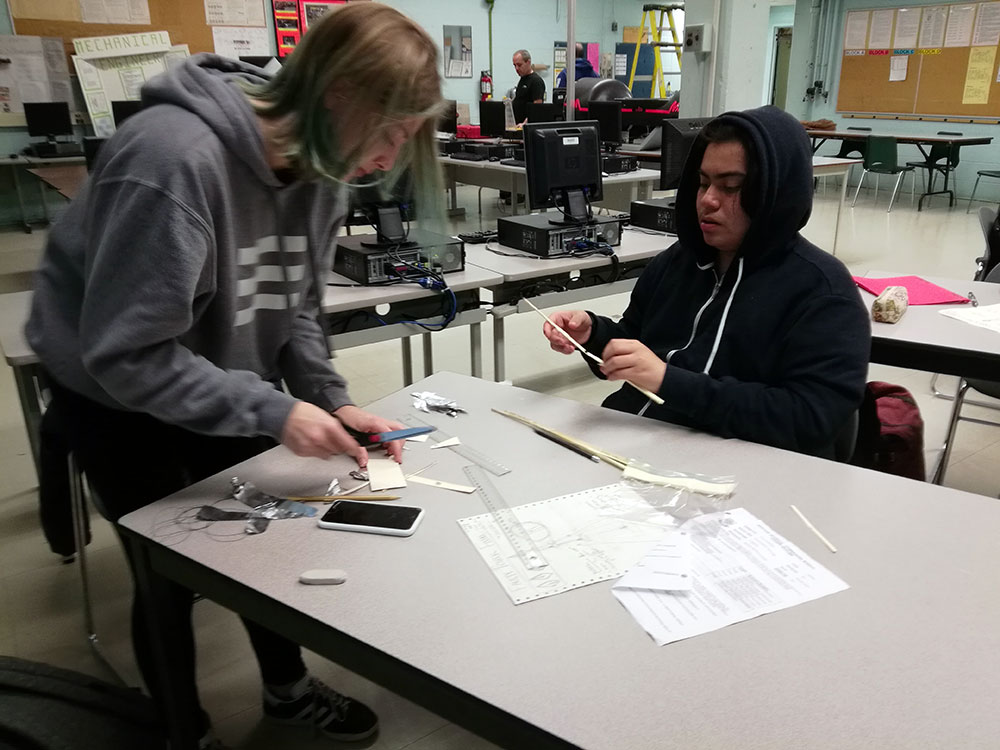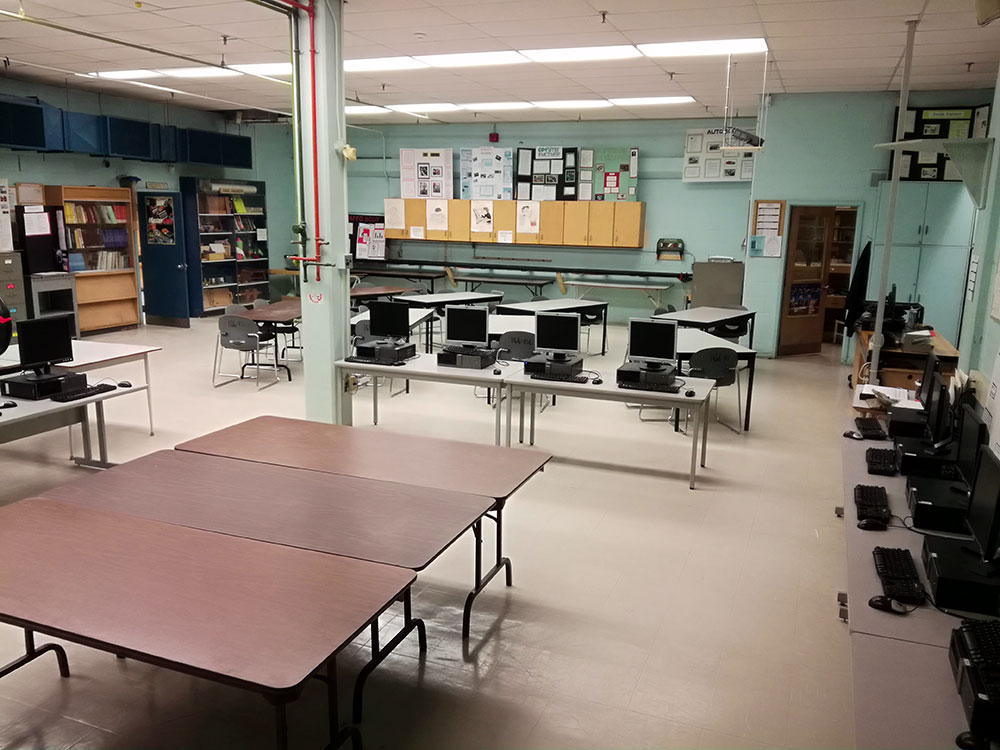 This program uses two adjoining rooms, a classroom and work shop. Both were revitalized in 2017-18 with equipment, tools, work benches, computers, and furniture. Students familiarize themselves with with the rooms and their resources. The classroom, room 166, consists of a theory area, computer lab, prototyping area, project testing area, Co2 dragster digital race track, wind tunnel, and library area. The work shop, room 165, consists of bench work areas, wood machines, table vices, multiple portable dust vacuums, CNC router, ventilated paint area, slop sink and Bradley Hand washing area, material shelves and cupboards, tool cabinets, and safety equipment resources - aprons, safety glasses, dust masks, hearing protection, eye wash station, etc. With both of these rooms, students use the resources to learn, research, design, build, and come up with solutions to given technological challenges. Techniques, process, tools, machines, computers, teamwork, co-operation all support students in this excellent, well organized and safe working environment/facility.