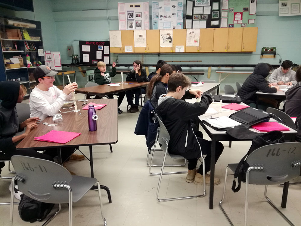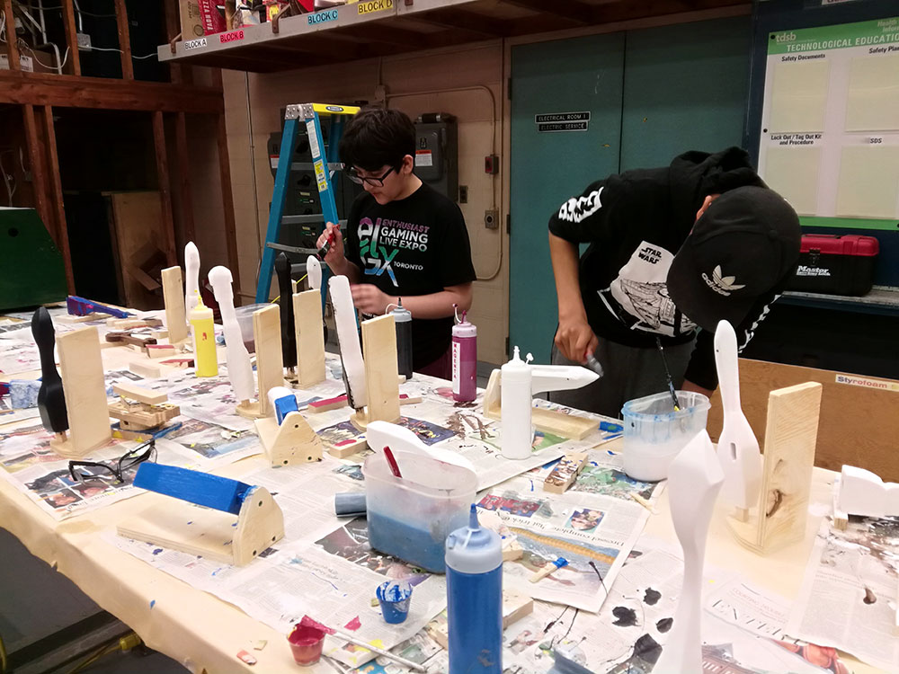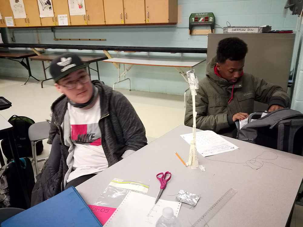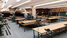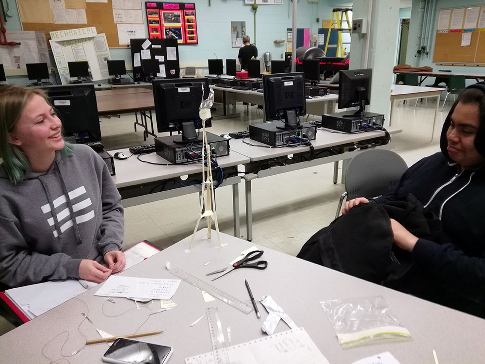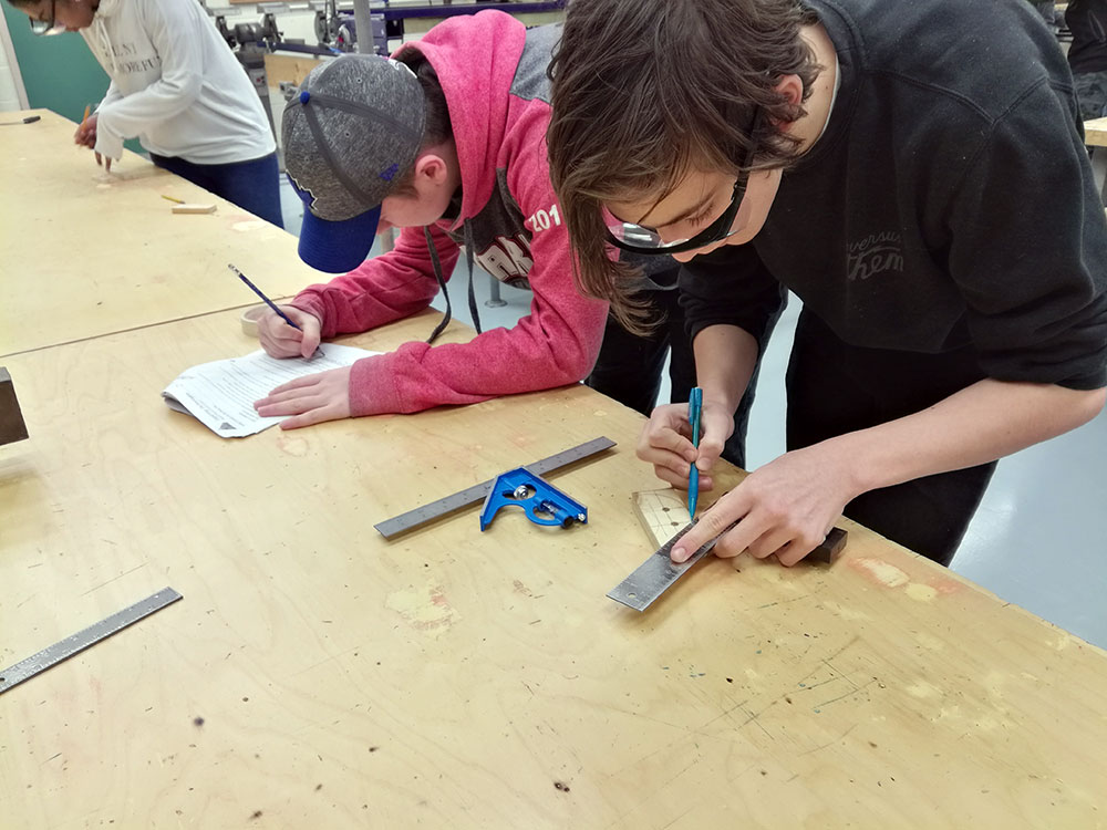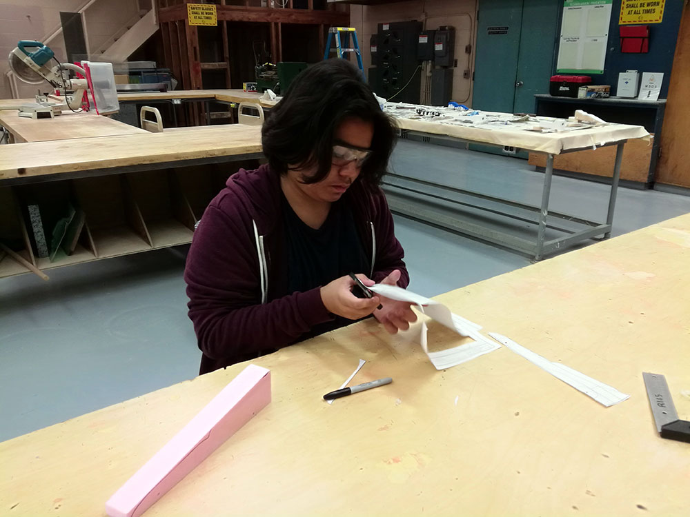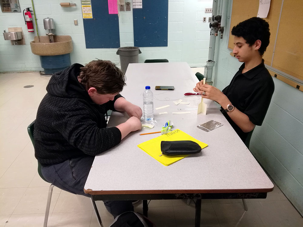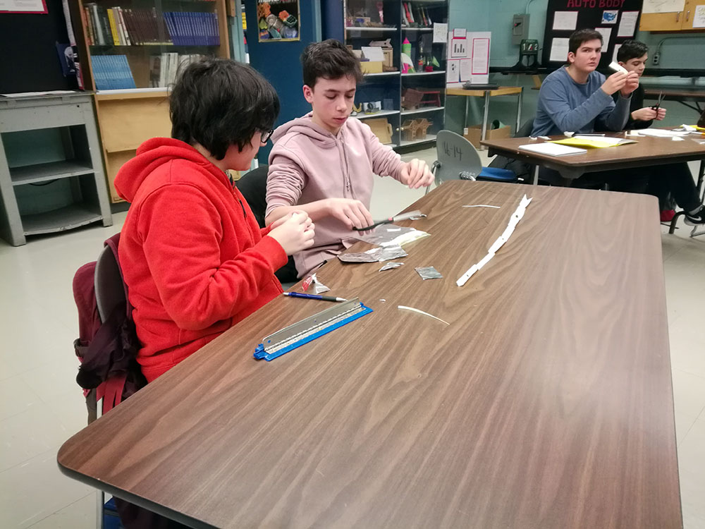 This program uses two adjoining rooms, a classroom and work shop. Both were revitalized in 2017-18 with equipment, tools, work benches, computers, and furniture. Students familiarize themselves with with the rooms and their resources. The classroom, room 166, consists of a theory area, computer lab, prototyping area, project testing area, Co2 dragster digital race track, wind tunnel, and library area. The work shop, room 165, consists of bench work areas, wood machines, table vices, multiple portable dust vacuums, CNC router, ventilated paint area, slop sink and Bradley Hand washing area, material shelves and cupboards, tool cabinets, and safety equipment resources - aprons, safety glasses, dust masks, hearing protection, eye wash station, etc. With both of these rooms, students use the resources to learn, research, design, build, and come up with solutions to given technological challenges. Techniques, process, tools, machines, computers, teamwork, co-operation all support students in this excellent, well organized and safe working environment/facility.
