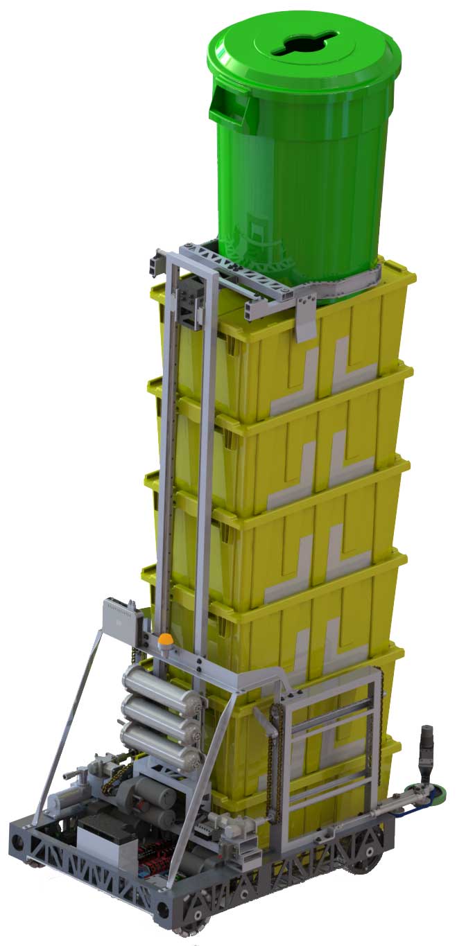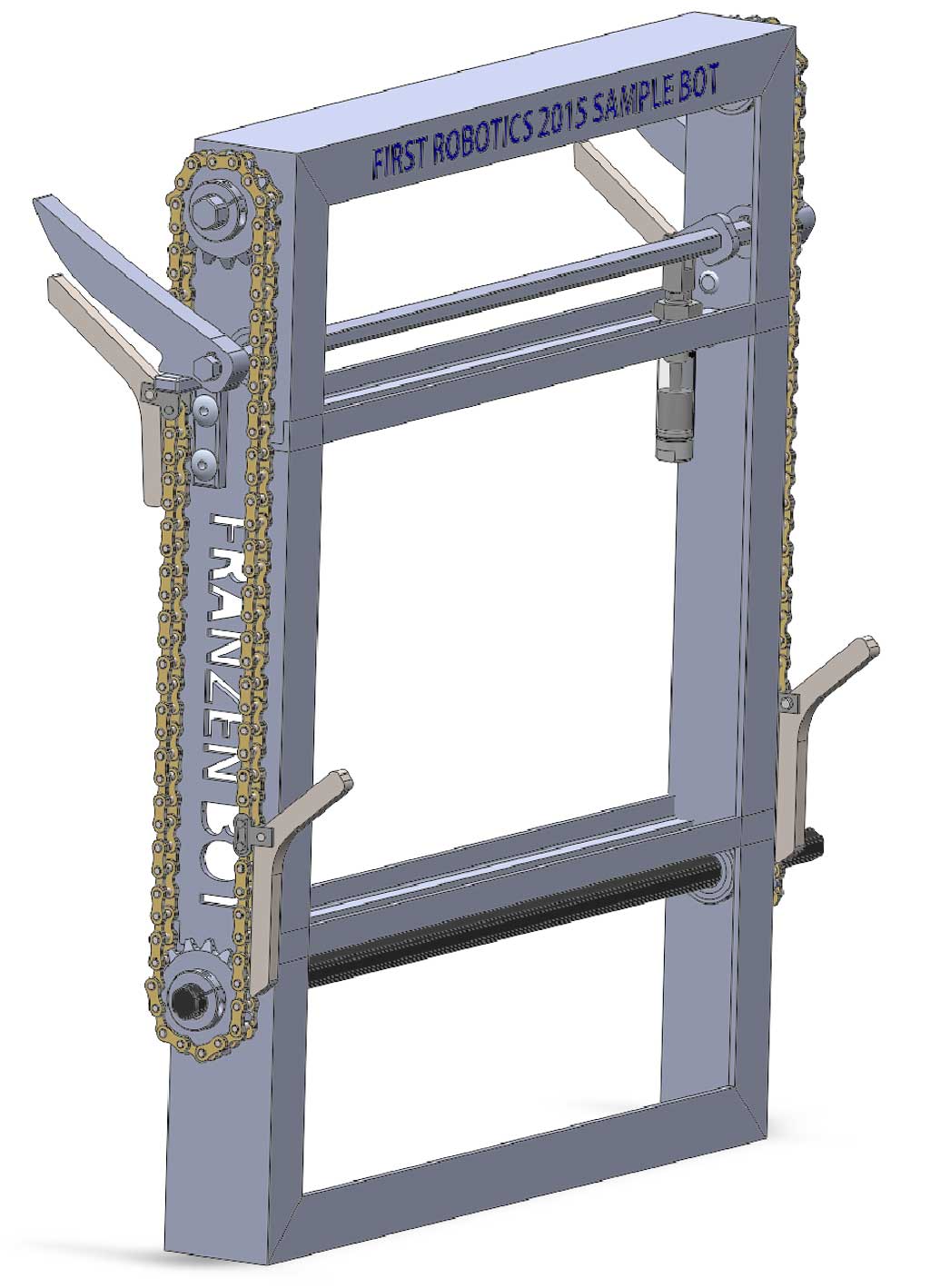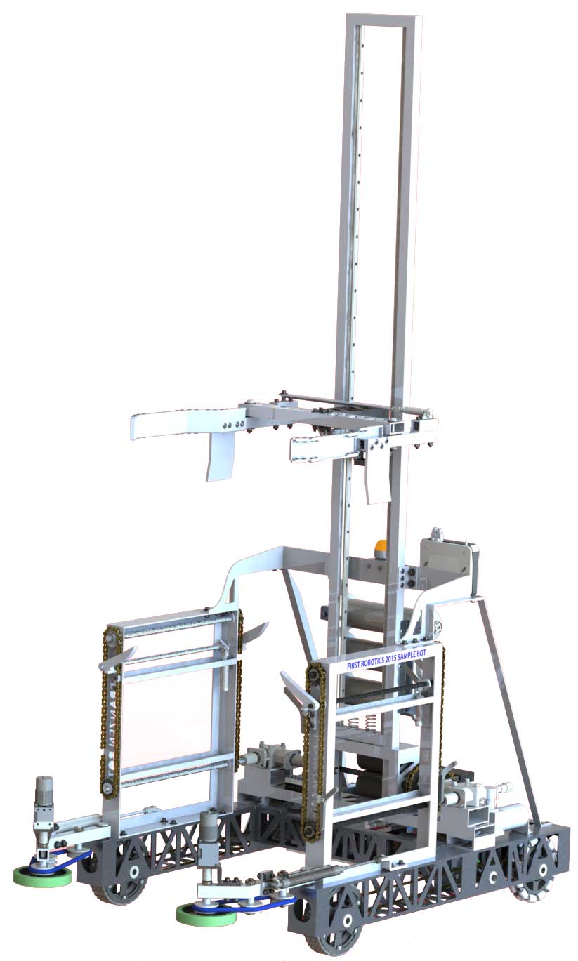This robot design model was created using SolidWorks 2014, which is a mechanical 3D engineering design application allowing you to draw your idea and virtual test. Below are three views showing the sample robot design from different angles and positions. The first one, the gripper has been raised out of the tote chamber area so the different mechanisms can be seen separately. The second rendered image shows the totes and recycling bin held in place, and the third, shows the gripper in its home position. Click on the images for a larger view of each.