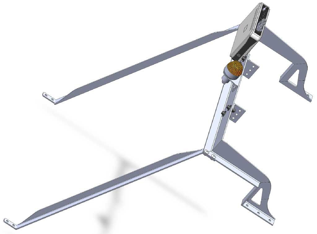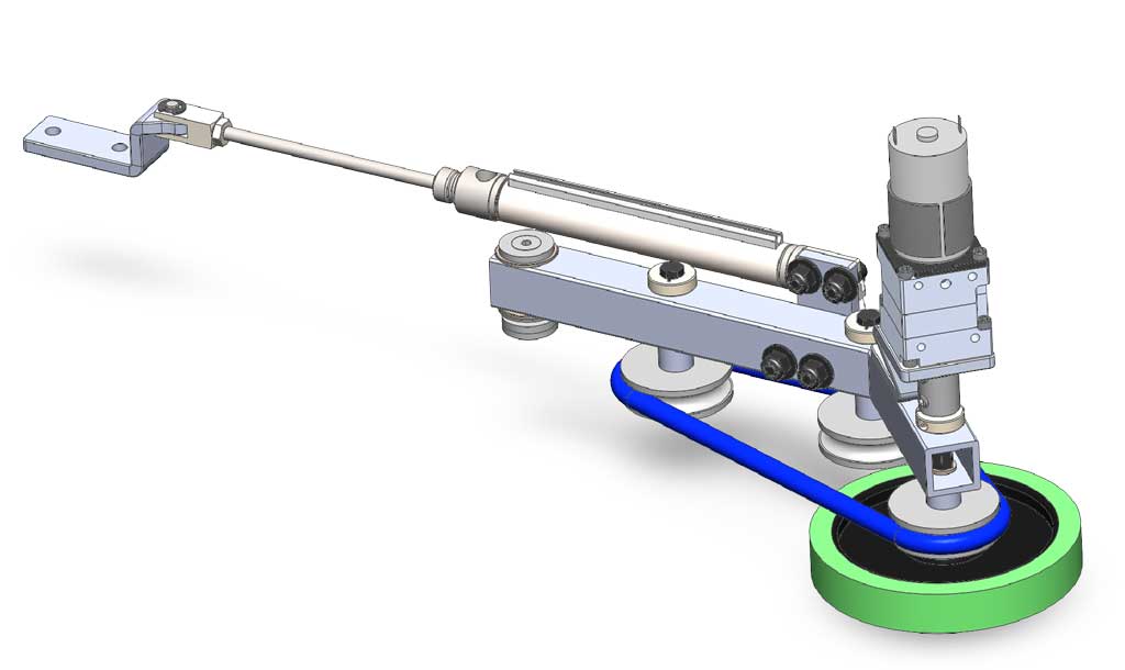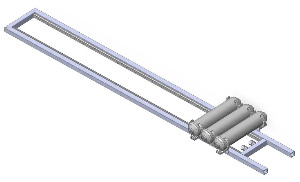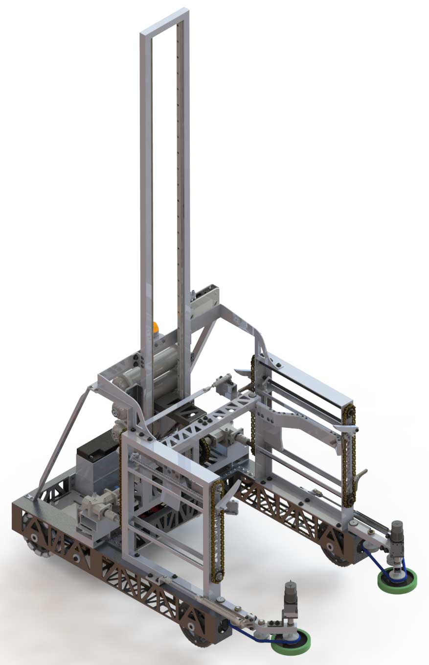 This robot design model was created using SolidWorks 2014, which is a mechanical 3D engineering design application allowing you to draw your idea and virtual test. Below are three views showing the sample robot design from different angles and positions. The first one, the gripper has been raised out of the tote chamber area so the different mechanisms can be seen separately. The second rendered image shows the totes and recycling bin held in place, and the third, shows the gripper in its home position. Click on the images for a larger view of each.