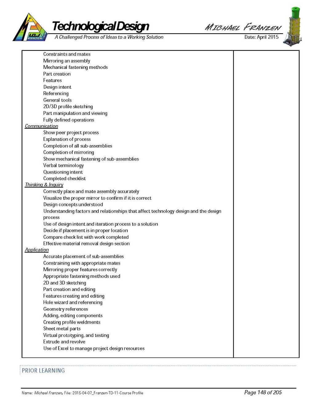 Technological Design is a great course medium for students to learn, through hands-on, open-ended projects. With 21st century teaching, focused on student centred, open-ended, differential classroom instruction, students apply themselves to these hands-on projects and gain meaningful related technology information and practical skills with a design process to accomplish some complex technical projects. Two main areas focused on here are Architectural and Robotic Engineering Design with some Industrial Design. Although the course profile is not detailed here, because of the scope and size of it, I have highlighted major projects with some reflective feedback on each.
