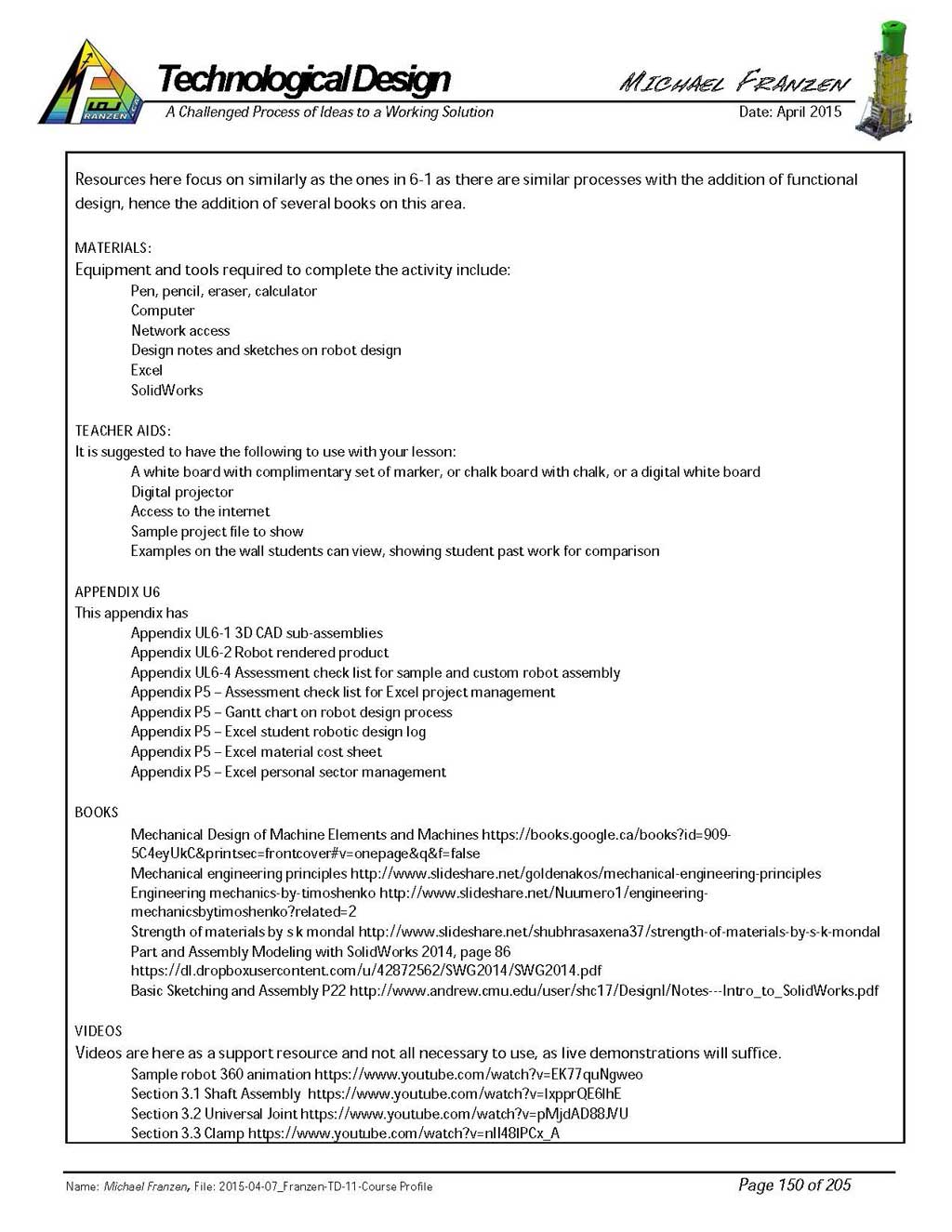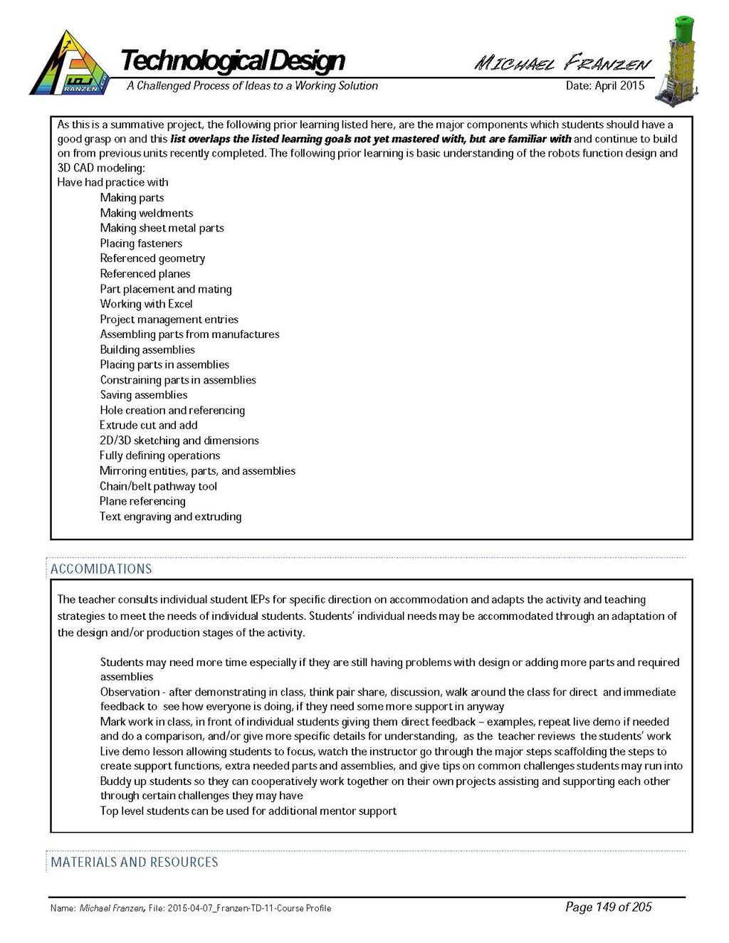 The senior project and the curriculum profile were the top two course projects that I gained the most from. The robot design project gave me the opportunity to learn SolidWorks, apply a complex design process, and build a sample robot that I can model as a practice project for students to use and learn from. The profile with the "project management toolbox" and detailed differential lesson plans will support students throughout the course. I pushed my capacity to maximize my learning and was able to refine some of my teaching strategies, knowledge, skills, and values as a result of taking this course.