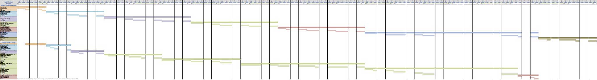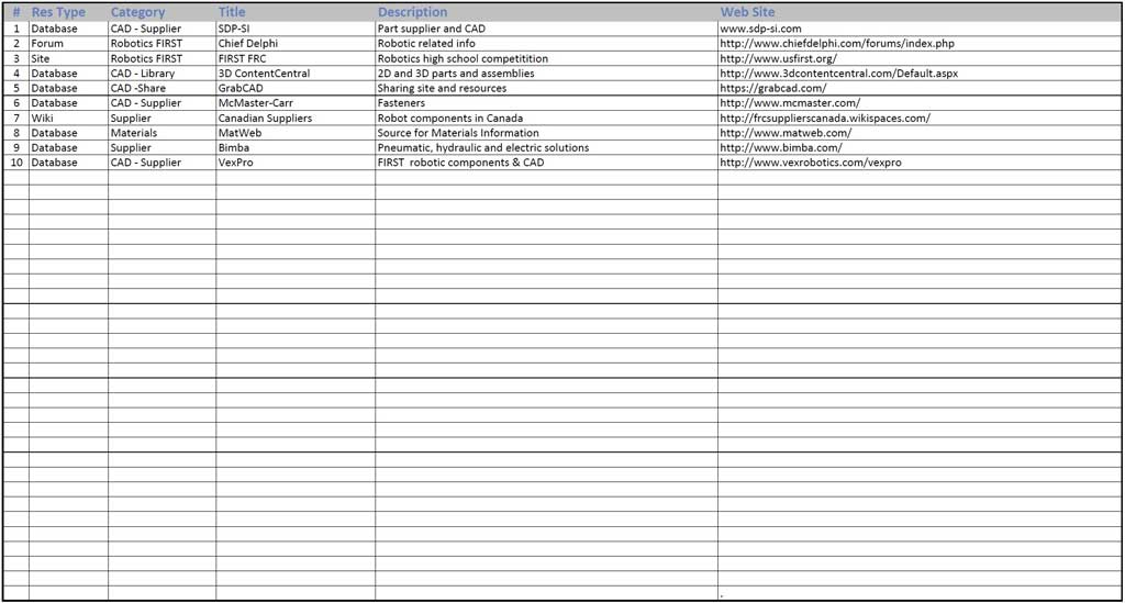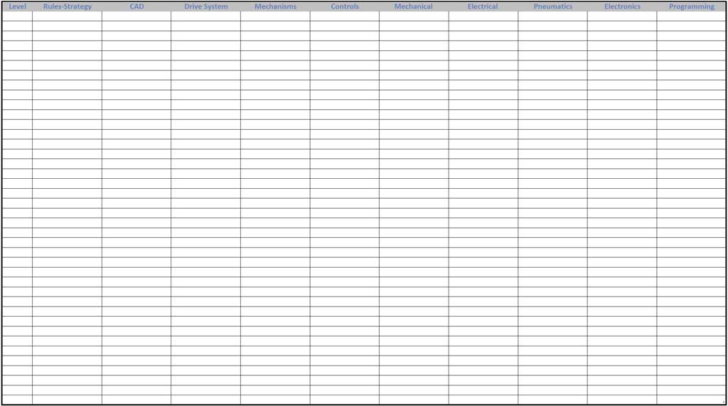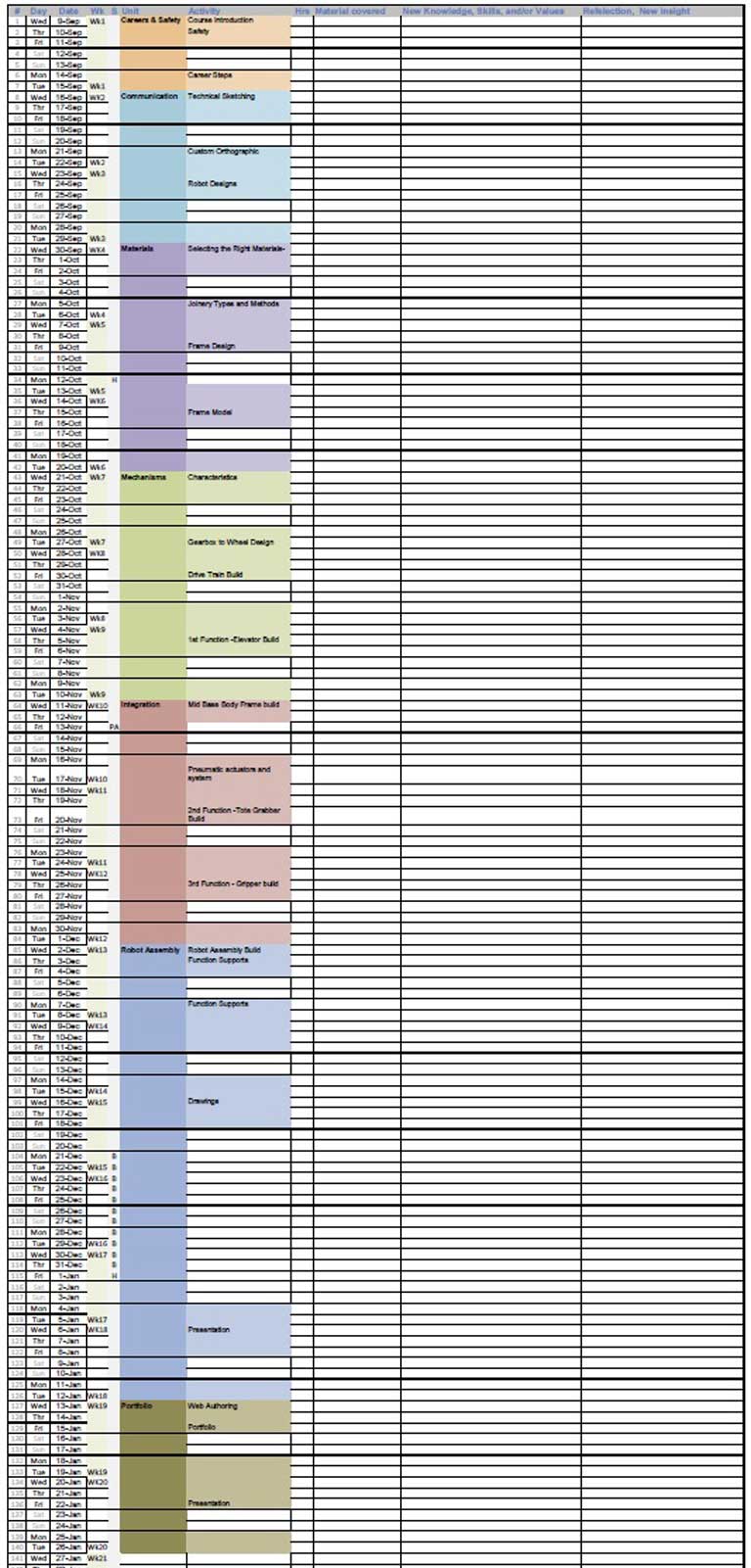 Having tools to keep students organized are very practical and useful. Although there are better project management programs out there, both application and online, Excel used in this manner with students does a great job to practically support individual students throughout the course. A check list assessment sheet would be used with this package so that students are aware of their responsibilities in using it throughout the course duration. With the robotics project students will be dealing with a lot of different parts, resource links, peer collaboration, design notes, and time lines. This set of Excel sheets will help keep them organized and focused on required steps to take. Using the Giant chart below allows you to see the process steps vs time line of both the course and the robot build process. Below shows a close up, of the start of the Gantt chart and also shows a full length version below that to give your an idea of the scope and size of each.