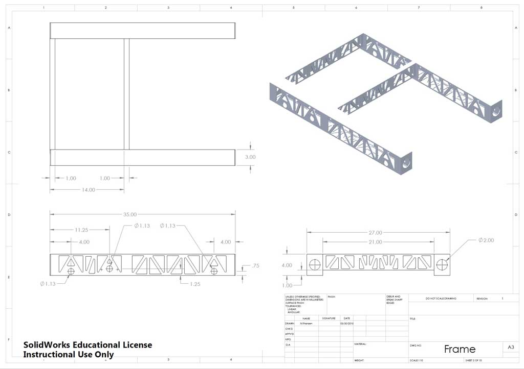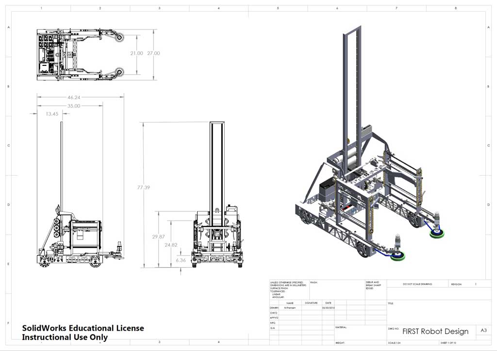 Robot drawings are based on the 3D model. Drawings allow you to communicate details on the design that you can not get from just looking at the 3D model. As this is a complex project, just the major components are shown here as there would be many individual parts in total that would end with numerous amount of drawings. For the purpose and scale of this project, this is an appropriate number of drawings for the student to demonstrate their knowledge and process of completing drawings.