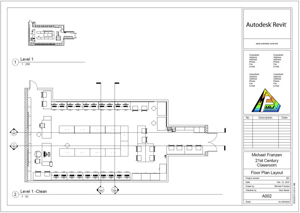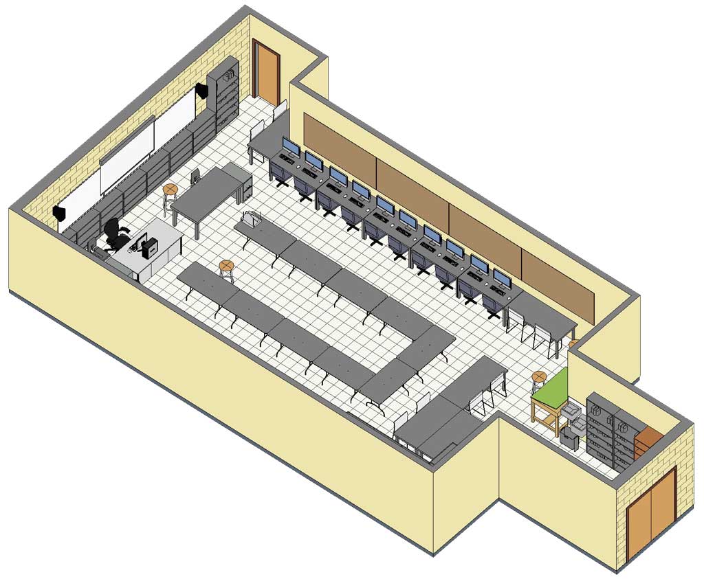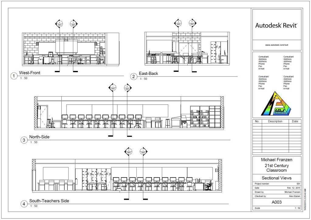 This project takes the current classroom and re-designs it to better suit 21st century teaching strategies. Using an initial 2D AutoCAD file to get precise dimensions, sketching out some ideas, then using AutoDesk's Revit to build a 3D model, you can design and build a new classroom model that better suits or supports 21st century teaching strategies. Below is an example of a room re-designed/improvement to better suit facilitating 21st century teaching strategies to support student centered, project based, open-ended, group work, collaboration, and differential instruction through an updated environment supporting 21st century teaching strategies.