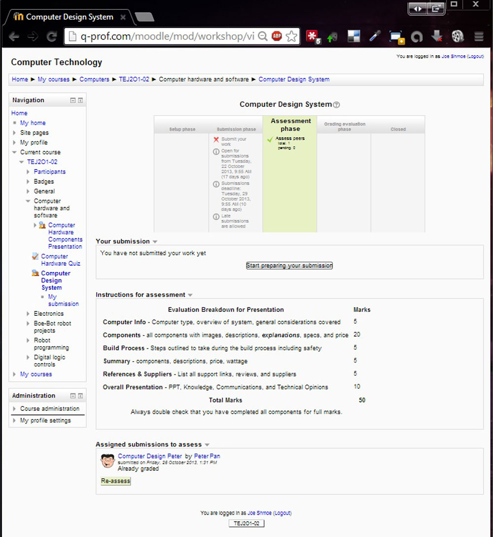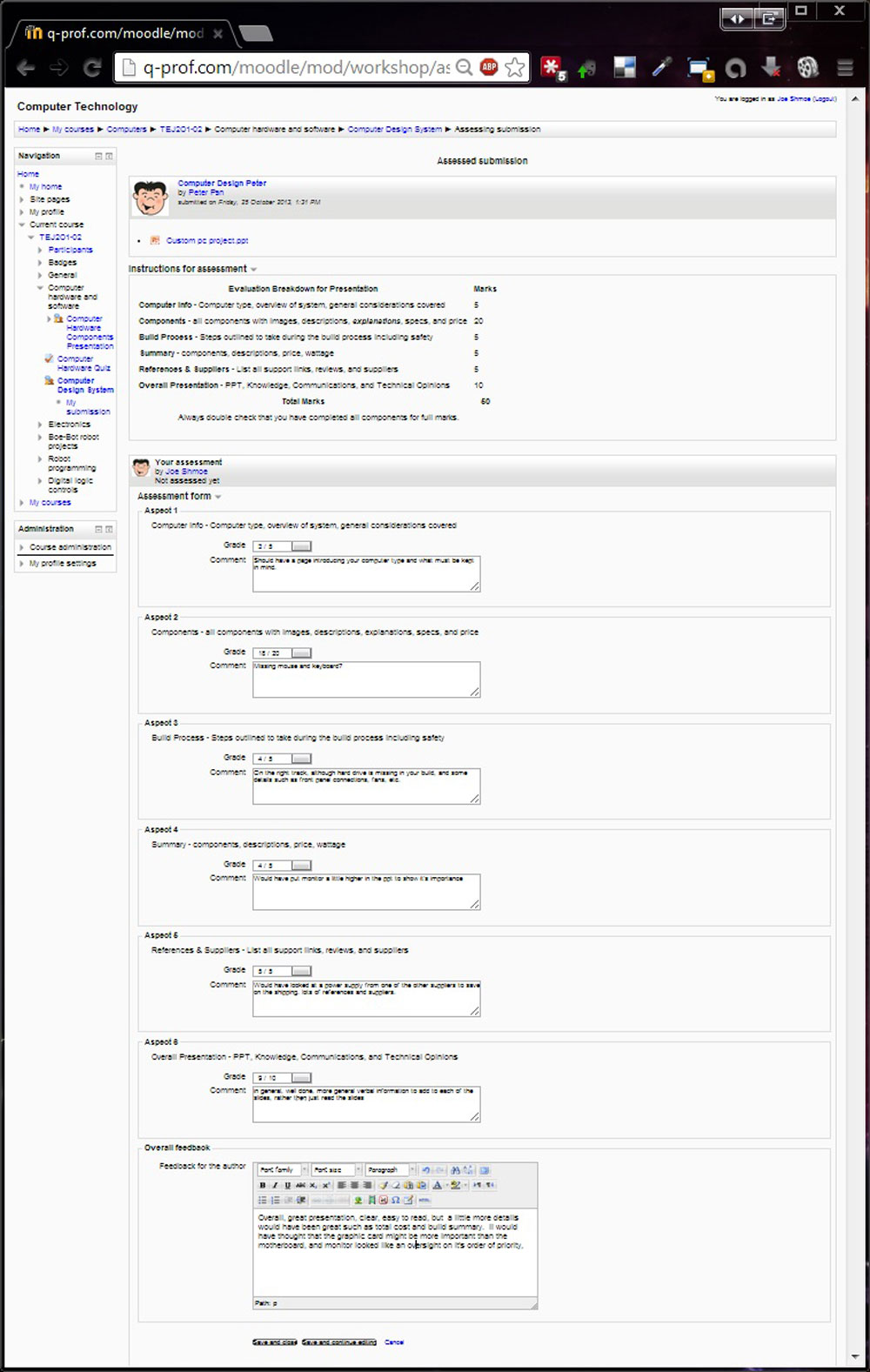 - Grading phase, students will depending on how the teacher has set it up, may be peer and/or self evaluation. Peer evaluation may include several different students work. When evaluating, you must make comments/explanation, based on why that mark was given - example 1,- example 2 shows that you can re asses again if you want to update your input